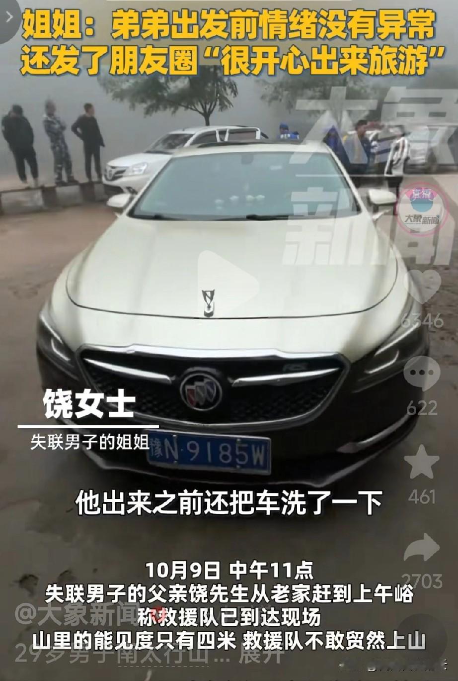 徒步去新乡南太行失联的男子,当时是穿着红衬衣,蓝色西装外套进山的。这就奇怪了,对于一个经常爬山,有经验的登山者而言,这种装扮去爬山不太合理。 我想男子这次是不是只去探探路,因为他的车还在农家乐旁边,生活用品也没带。他也答应母亲,会先找个旅馆住下的,我猜测他可能是进山后迷路了,走不出来了。 因为救援队找他的时候,说山里时常有大雾,能见度三四米。救援人员都不敢贸然往里走。 男子是家里的独子,他出来爬山父母知道,但是他撒谎说是两人一起爬山的。他撒谎应该是怕父母担心,但是一个成年人了,即使你再有挑战精神,独自出来徒步,也一定要做好安全防护,和家人做好报备。 还有当时他给农家乐打电话的时候,说自己迷路了,当时为什么不打电话报警呢?说是看到亮光了,想自己走回来,山里的情况太复杂,还是太高估自己了。 不管怎么说,希望平安归来!