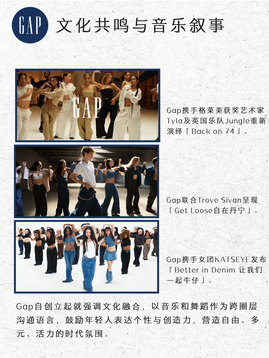 Gap自创立以来便以音乐和舞蹈连接全球青年,近年来也在不断重塑其在全球流行文化中的话语权。