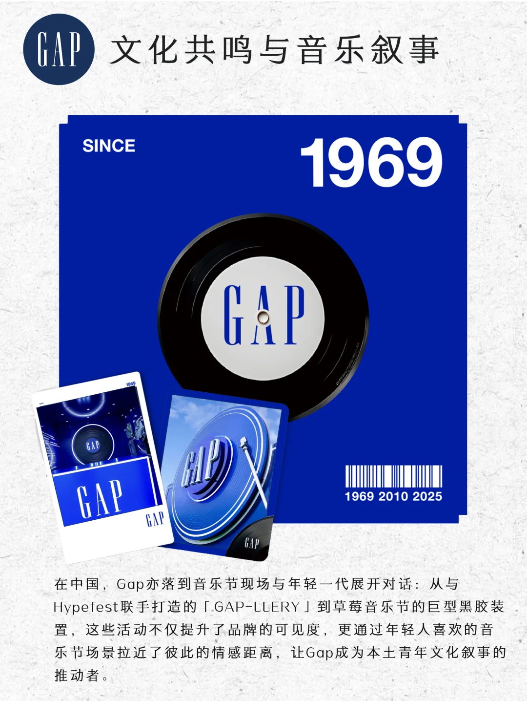 在中国,Gap亦落到音乐节现场与年轻一代展开对话:从与Hypefest联手打造的「GAP-LLERY」到草莓音乐节的巨型黑胶装置,这些活动不仅提升了品牌的可见度,更通过年轻人喜欢的音乐节场景拉近了彼此的情感距离,让Gap成为本土青年文化叙事的推动者。