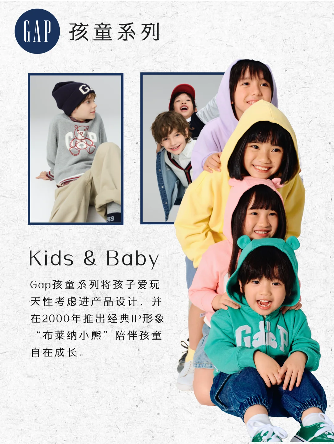 丹宁系列兼具风格与舒适感,鼓励年青群体率性自由的自我表达;卡其系列简约百搭,满足通勤与休闲需求;卫衣作为美式休闲代表,打造松弛自在氛围;童装系列则以“布莱纳小熊”为经典符号和孩子们玩在一起。