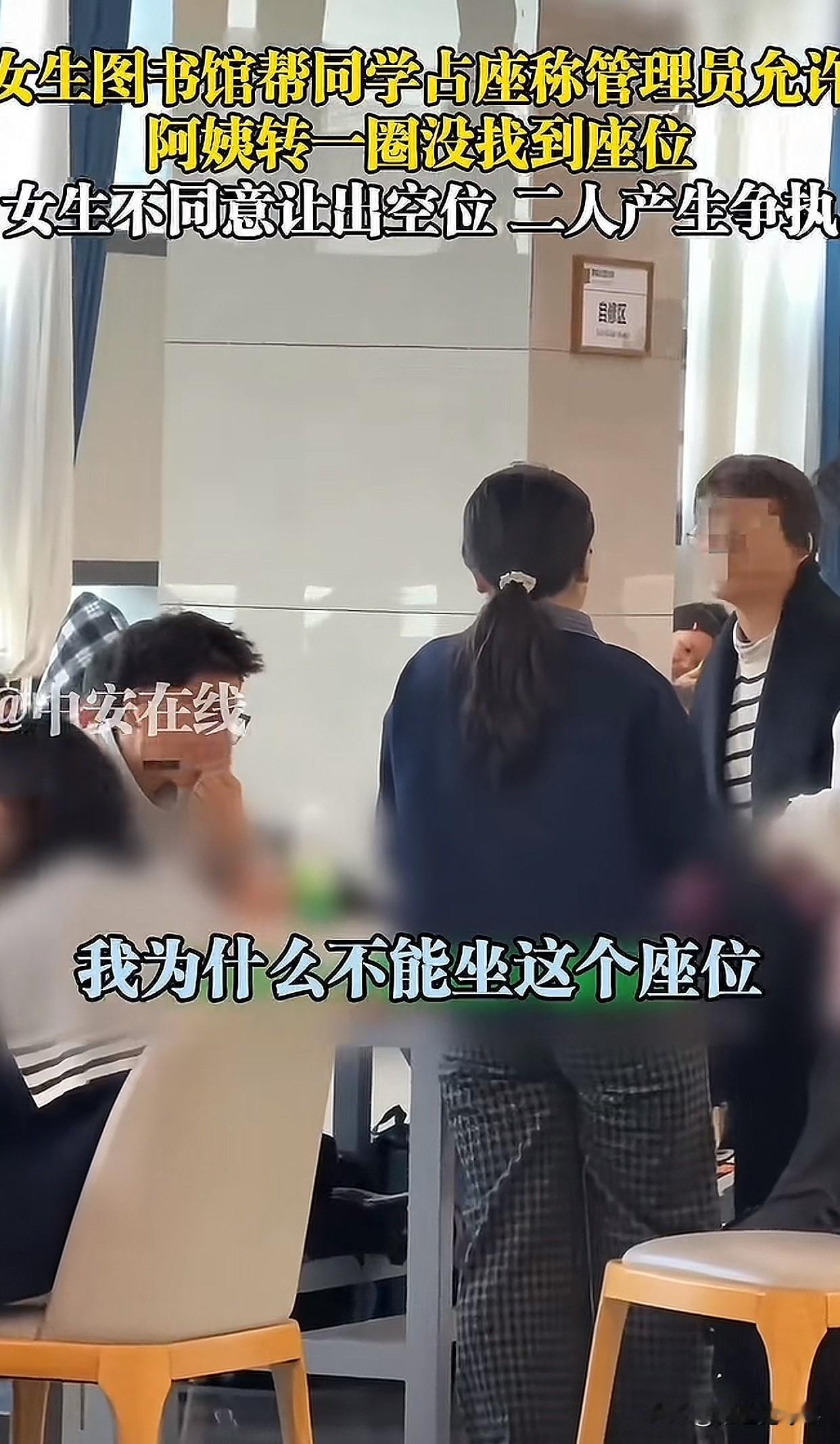 “真的很离谱!”山东聊城某图书馆,一女孩帮朋友占座位,有位阿姨想坐却被拒绝,两人就吵起来了。女孩说管理员都允许这么干,但阿姨觉得这太不合理了。 当时阿姨想坐下,女孩说这个位置有人了。阿姨转了一圈发现没别的空位,回来见这个位置还空着,女孩还是不让坐。说实话我觉得这就有点过分了。 公共资源本来就有限,占座看着是小事,其实挺自私的。图书馆是大家的地方,规矩不能由着一个人说了算。 要我说,占座就像在隐形插队。人不在却占着位置,等于把别人的机会给抢了。真要帮朋友占座,不如直接叫朋友早点来。我觉得文明社会就得互相体谅,规矩是基础,但自觉更重要。大家一起维护好环境,得从小事做起。