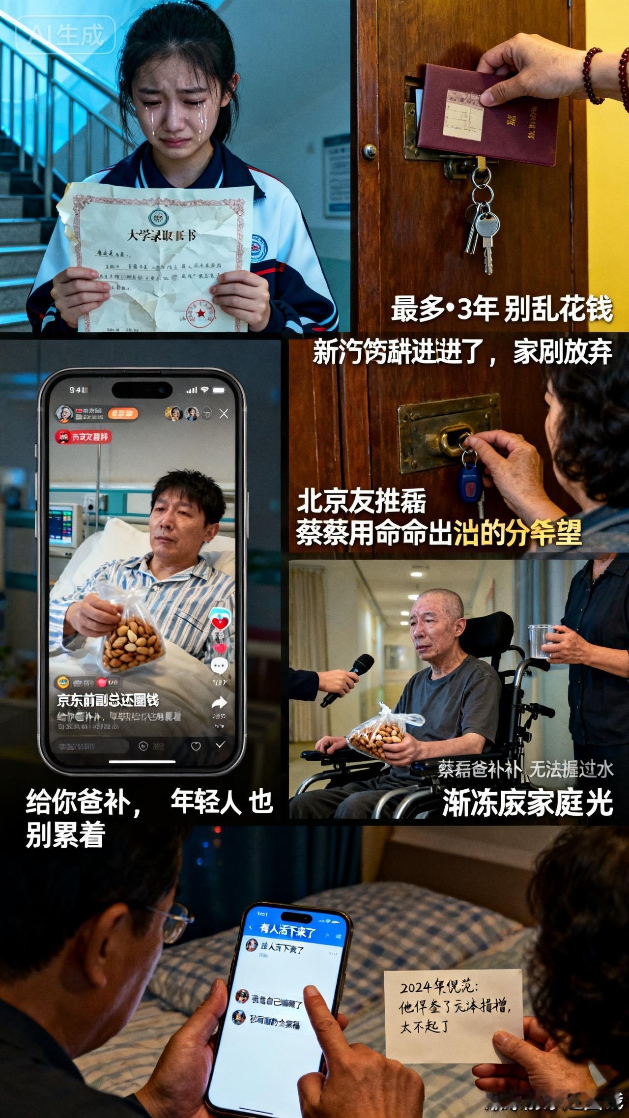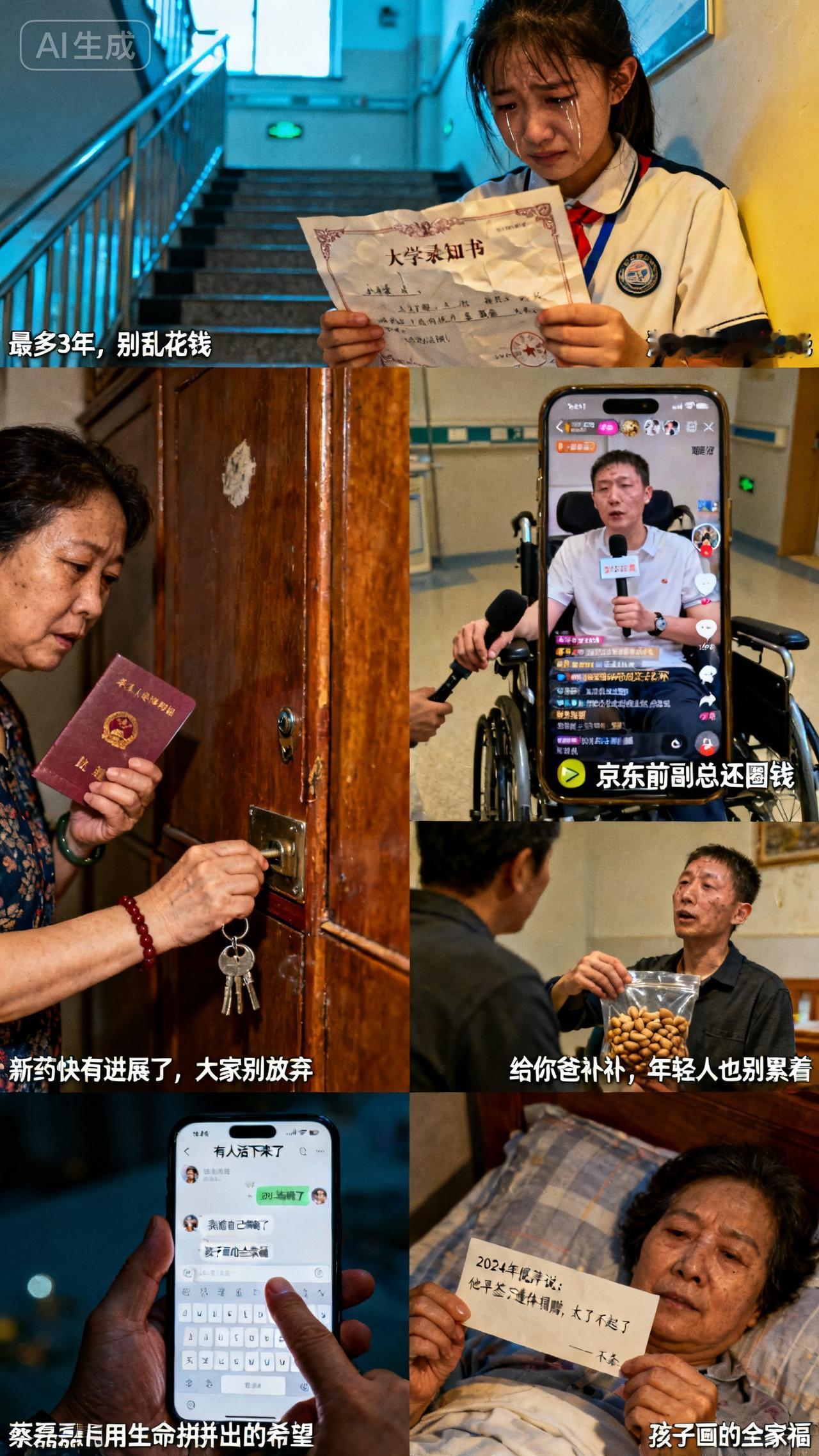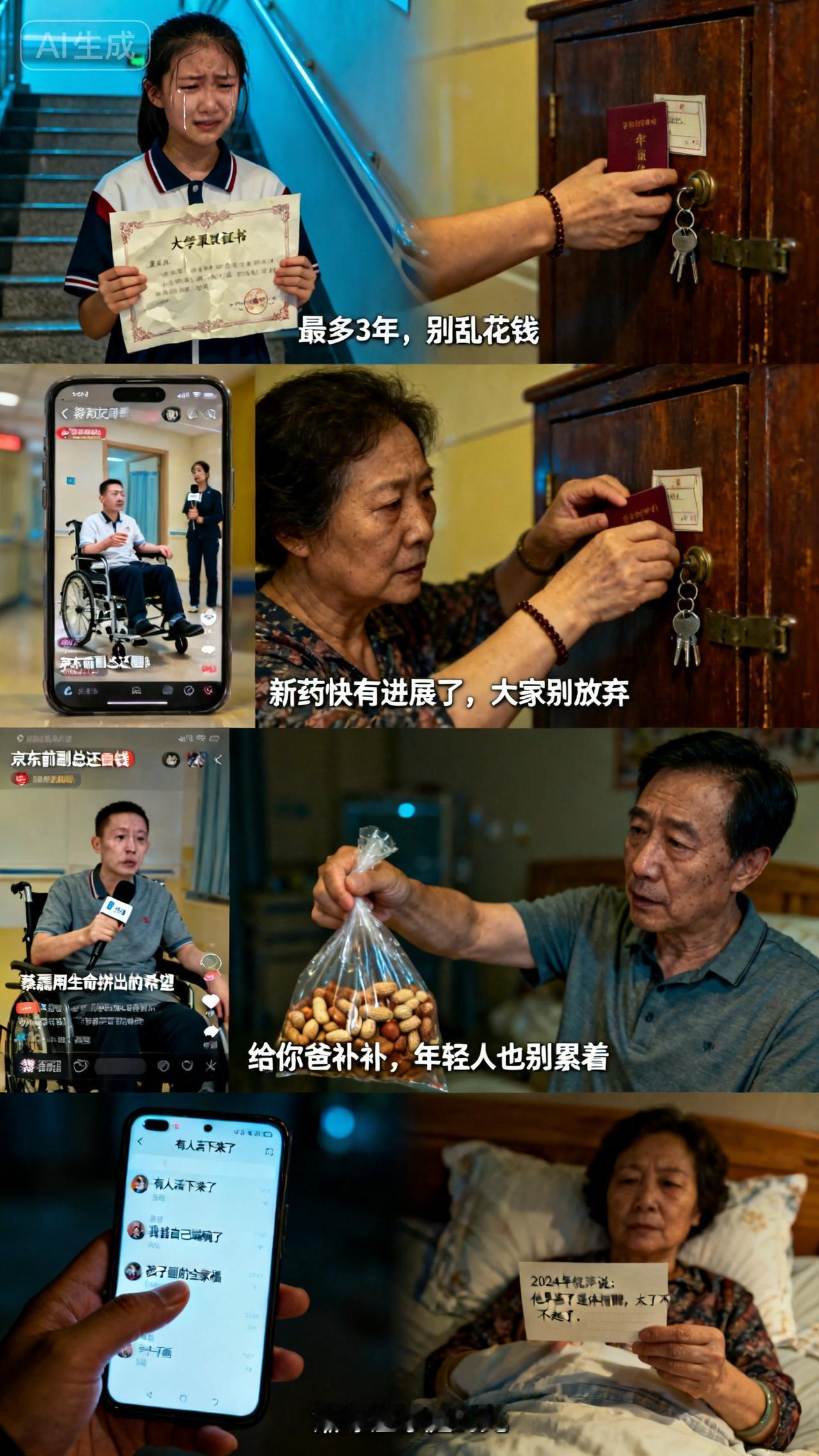 骂蔡磊“钱再多治不好病”的人,如今被他用眼球敲出的奇迹打了脸 我爸查出渐冻症那天,我攥着大学录取通知书在医院楼梯间哭,纸角都被眼泪泡得发皱,油墨晕开一小片黑。医生拉着我妈说“最多3年,别乱花钱”,我妈当晚就把我的学费存折锁进老式木柜,钥匙串在手腕上,红着眼说“书咱先不念,给你爸买能喘气的药”。 后来在病友群刷到蔡磊的直播,他坐在轮椅上,手僵得连水杯都拿不住,助理帮他举着话筒,他说话有点卡,却反复说“新药快有进展了,大家别放弃”。评论区有人骂“京东前副总还圈钱”,我气得想怼,却看见蔡磊让助理翻出一张捐赠凭证——纸边都磨毛了,上面的字歪歪扭扭,是他把北京那套学区房卖了的钱,全捐给了实验室。蔡磊用生命拼出的希望 我抱着试试的心态给蔡磊团队发了私信,没想到第二天就收到电话,说帮我爸申请了免费试药名额。去北京见他那天,他刚试完药,脸色白得像纸,却还笑着跟我说“你爸这情况有希望,再等等”,说话时嘴角牵起的弧度特别轻,像怕扯到没恢复的神经。临走时,他让助理塞给我一袋坚果,说“给你爸补补,年轻人也别累着”。渐冻症家庭的光 上个月深夜,我爸躺在床上,用仅能动的右手食指,一下下点着手机屏幕,突然哭着喊我:“你看!蔡磊说有人活下来了!”我凑过去,屏幕上是他用眼球敲的字,下面病友们的评论刷得飞快,有人说“我能自己端碗了”,有人发了张孩子画的全家福。我妈翻出2024年倪萍哭着说的话:“他早签了遗体捐赠,太了不起了”,我突然就懂了,蔡磊哪是在救自己,是在给我们这些快撑不下去的家庭搭梯子。 现在我爸每天都要让我读蔡磊的最新动态,说“等我好点,要去北京给蔡总鞠个躬,把咱家腌的腊肉给他带点”。那些曾经嘲讽他“钱再多没用”的人,该看看这用命拼出来的希望了吧?如果你身边有这样跟命运死磕的人,你会怎么帮他撑下去?蔡磊寄语年轻人