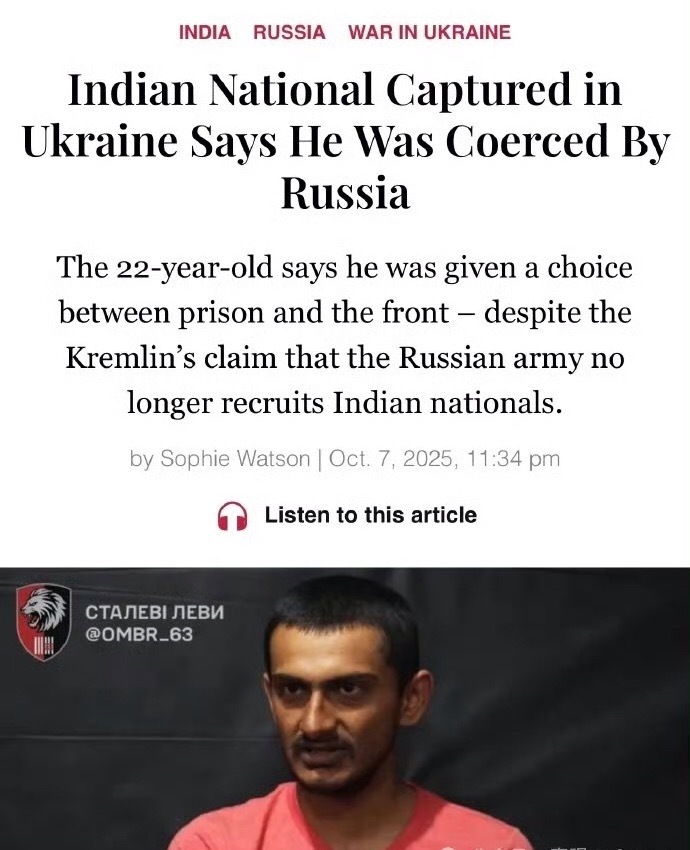 乌军10月7日宣布,俘虏了一名印度籍俄军马乔蒂·穆罕默德·侯赛因。