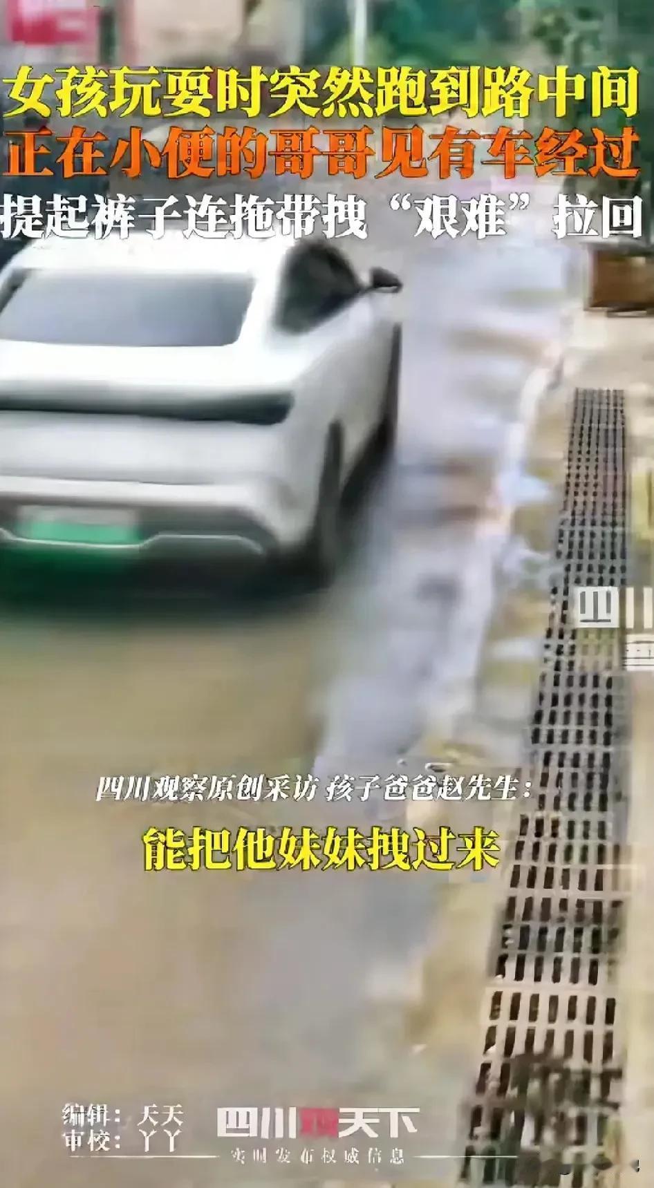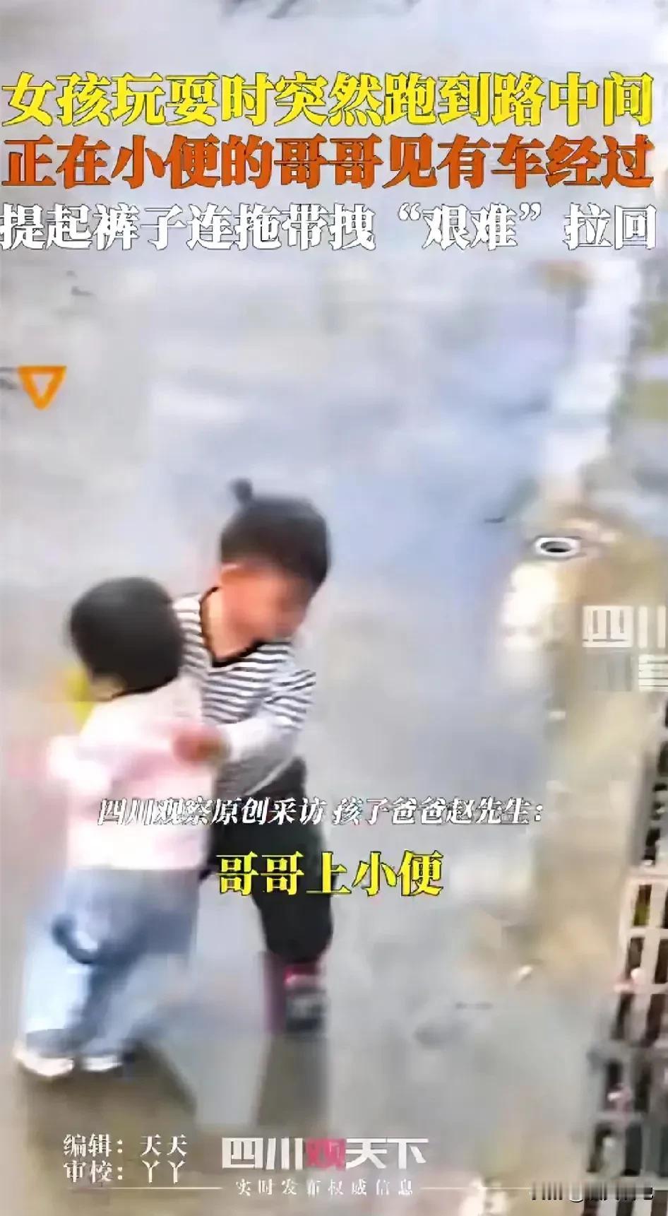 太机智了!安徽淮北,小男孩正在路边方便,突然发现妹妹挣脱玩耍冲向了马路中央!而此时,一辆车正朝这边驶来,没想到,他做出了一个选择,接下来的一幕让所有人又惊又暖! (来源:四川观察) 这天,这男孩在家门口玩耍,突然有点尿急,便站在路连小便。 没想到,妹妹冲了出来,跑到了路中间,刚好有一辆轿车从路对面驶来,眼看就要和妹妹碰头。 小男孩来不及多想,硬生生的把尿憋了回去,提着裤子一把把妹妹往回拽,生怕妹妹有啥闪失。 此时,妹妹还没有反应过来,就这样平躺着被哥拉了回来,从画面可以看出有点搞笑。 刚来,这一幕被爸爸发现,必竟孩子才3岁,他也是特别的欣慰。 这个片断被发上网上,网友都拍手称赞哥哥: 有的网友说:“小男孩太优秀了,小小年纪就知道保护妹妹了,将来也是个暖男。” 也有网友说:“这小男孩长大绝对有出息,是个人物!干事干净,不拖泥带水的!” 还有网友说:“既把住尿,又把住妹妹了。” 是啊,小小年纪,在妹妹有危险时,能挺身而出,不愧是当哥哥的。 很多时候,危急时刻的本能抉择,恰恰映照出一个人心底的光芒。 这个手提裤子、憋住尿意也要一把拉回妹妹的小男孩,让我们看到了一种最纯粹的勇敢与温柔。 这样的孩子,哪怕年纪再小,也已拥有了顶天立地的模样。他拽回的是妹妹的安全,也是一个哥哥无声却坚定的爱。 对此,你怎么看呢?