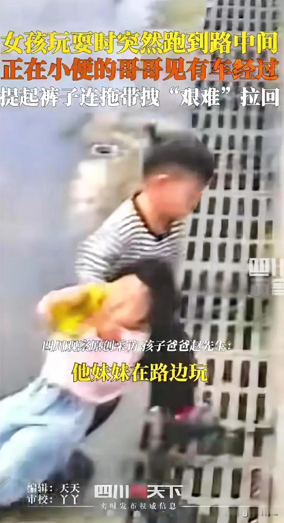 太机智了!安徽淮北,小男孩正在路边方便,突然发现妹妹挣脱玩耍冲向了马路中央!而此