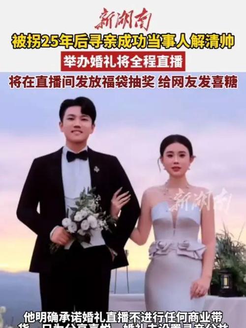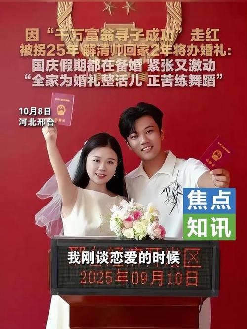 10月12日,被拐25年的解清帅在河北邢台举行婚礼,与相恋四年的女友步入婚姻殿堂[__LINK_ICON]。婚礼设百桌宴席,杜小华、杨妞花等寻亲亲友到场祝福,母亲坐轮椅坚持见证,父亲解克锋全力操办显珍视[__LINK_ICON]。他开启直播分享喜悦,喜糖藏"团圆"寓意,这场婚礼既是新人喜讯,更是寻亲家庭团圆的圆满注脚。解清帅恋情 解帅爸爸