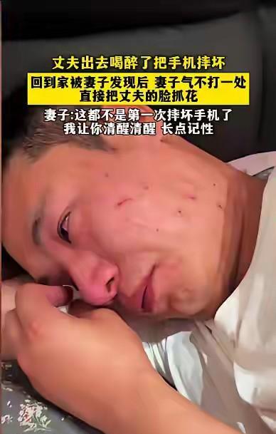 男人出去吃饭喝醉了,把手机给摔坏了,回到家后被妻子发现了,气的妻子把男人的脸直接抓花了,看着男人委屈的样子,大家认为妻子的这做法对不对呢? 可能很多人都会说,这男人不就出去吃顿饭喝个酒,喝醉了后把手机给摔坏了,为这么点小事,妻子就把男人的脸抓花了,真是小题大做,太不应该了,可是没想到男人的妻子却说,这已经不是男人第一次喝醉酒后摔坏手机了,她之所以把男人脸抓花,为了的也是让他清醒清醒,长点记性,以后不要在外面喝酒喝醉了! 其实我很支持妻子的这种做法,因为她真正心疼的,并不是摔坏的手机,而是喝醉酒的男人,而且这都已经不是男人第一次摔坏手机了,喝醉酒后摔坏手机确实是件小事,但是谁敢保证男人下次喝醉酒后,又会做出什么离谱的事情呢,我想这才是让妻子最恼火的问题! 那么大家认为,妻子的这种做法对不对呢,男人通过这次的教训,以后真的能长记性吗?
