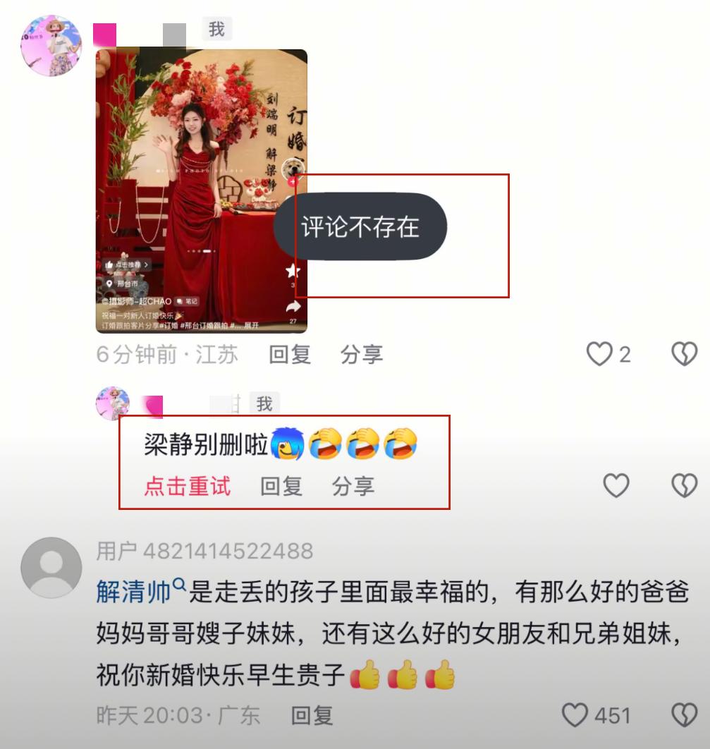 没想到啊,解清帅这次居然是“双喜临门”。 10月12号,解清帅与王正正的婚礼在邢台正式举行,作为备受关注的寻亲圈网红,解清帅虽然饱受争议,但他的妹妹解梁静却一直备受网友的喜欢,从当初认亲到现在,几乎没有人不喜欢她,超高的情商,以及漂亮的脸蛋,完美的身材等等,另外还有让人羡慕的公务员工作,每一样都让人“疯狂”。 昨晚,有一位来自邢台的摄影师拍摄了一组订婚的画面,不过没有多久后就被删除,至于原因可想而知。 从曝光的画面中不难看出,订婚人便是解梁静,男方则叫刘瑞明,这与23年被扒的男友姓名是一样的,这就说明解梁静与其交往了好几年,且这期间并没有因为爆红而移情别恋,这一点值得赞扬。 至于摄影师为何删除,想来是因为解梁静方面给的压力,那么解梁静这么做的目的是什么呢?很明显是为了接下来的流量,不过还是要恭喜他们顺利订婚,今天可谓是双喜临门。