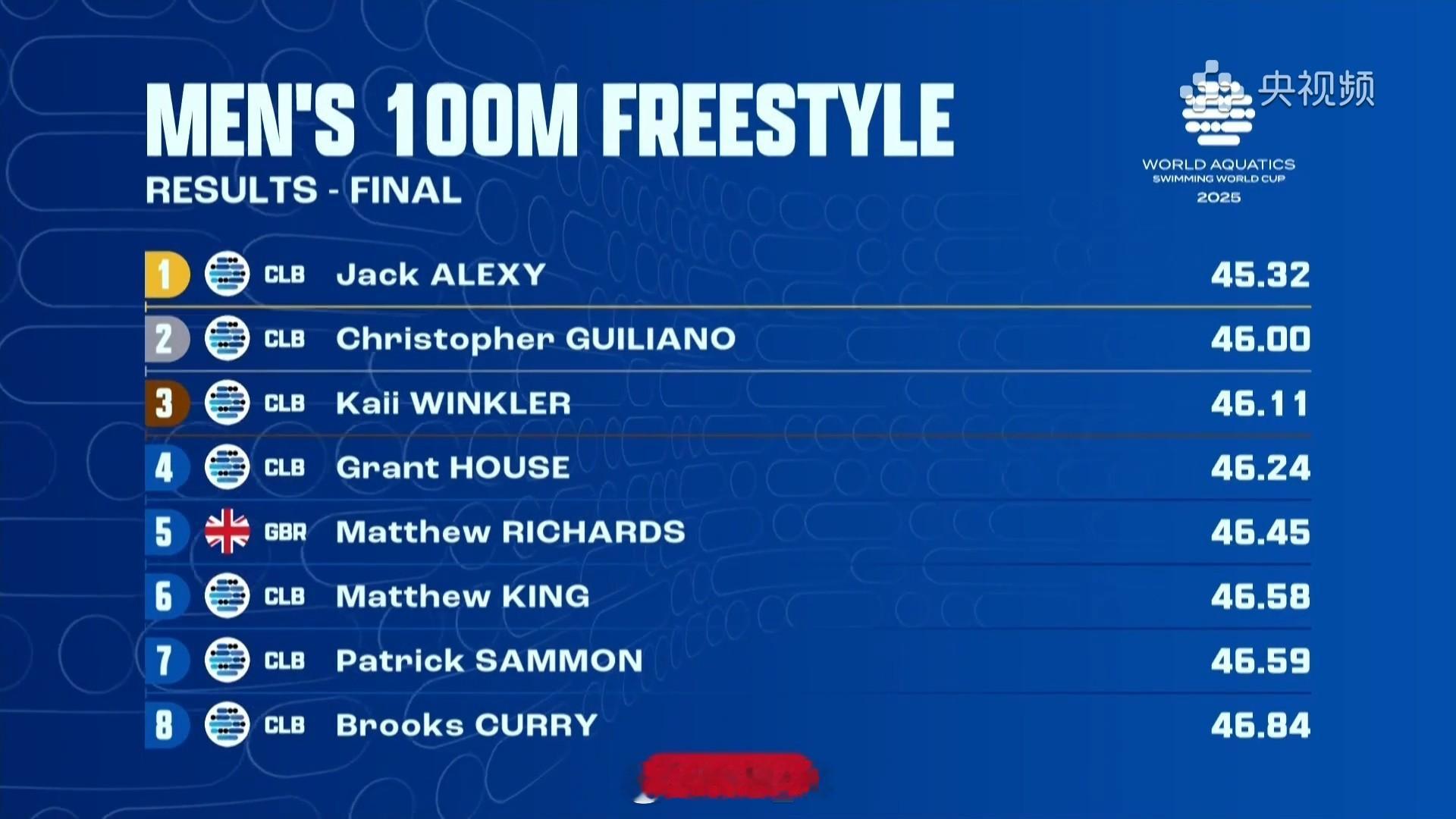 短池游泳世界杯卡梅尔站 男100自决赛