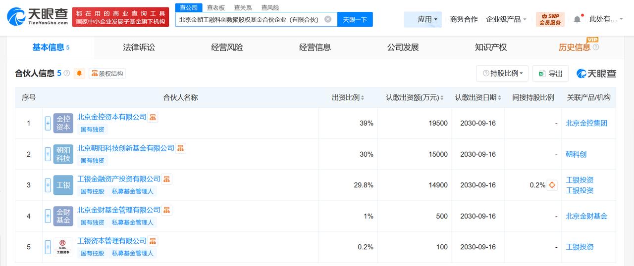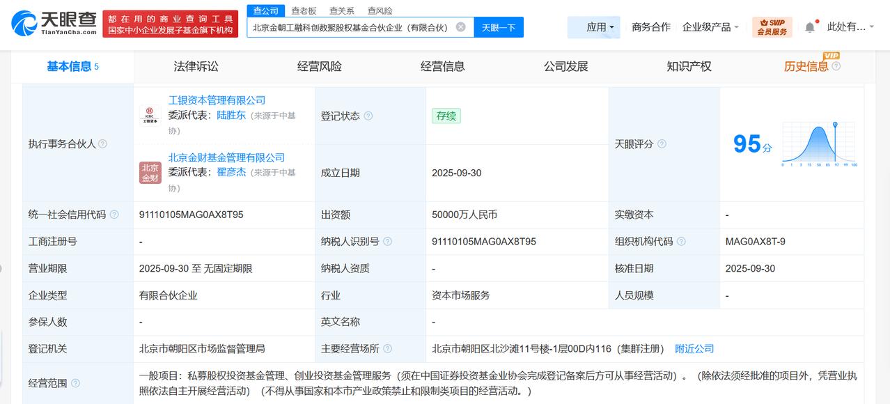 工银投资等成立科创数聚股权基金出资额5亿 天眼查工商信息显示,近日,北京金朝工融科创数聚股权基金合伙企业(有限合伙)成立,执行事务合伙人为工银资本管理有限公司、北京金财基金管理有限公司,出资额5亿人民币,经营范围为私募股权投资基金管理、创业投资基金管理服务。合伙人信息显示,该基金由北京金控资本有限公司、北京朝阳科技创新基金有限公司、工银金融资产投资有限公司、北京金财基金管理有限公司、工银资本管理有限公司共同出资。 天眼查信息: