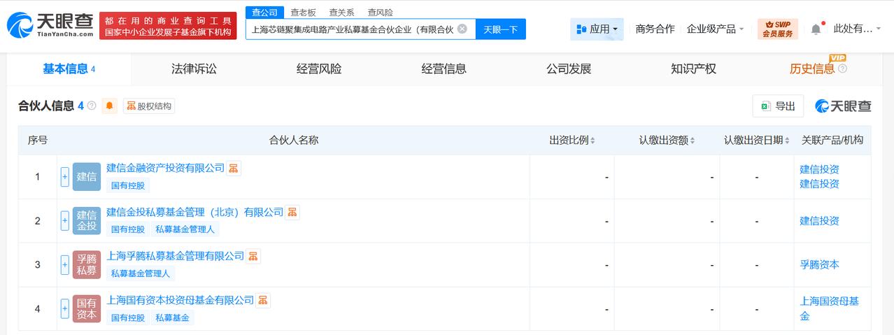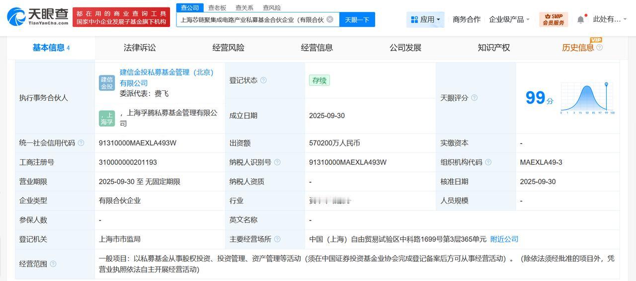 上海芯链聚集成电路产业私募基金成立出资额57.02亿 天眼查工商信息显示,近日,