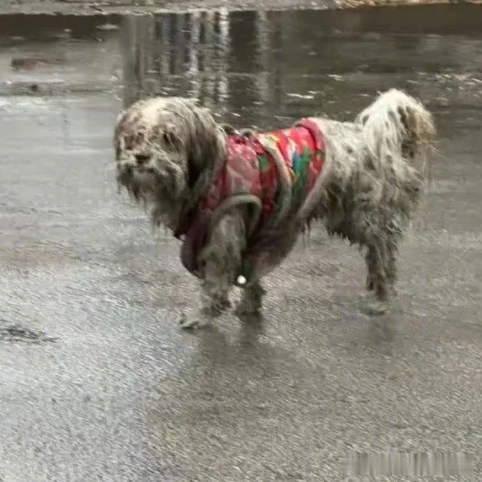一只流浪狗身穿脏兮兮的花棉袄在雨中徘徊,可以看出:它曾经也是被主人宠爱备至的毛孩