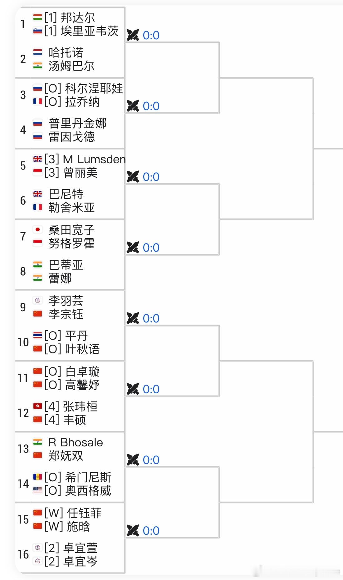 双打方面 🇨🇳丰硕/🇭🇰张玮桓4号种子、🇨🇳高馨妤/🇨🇳白卓璇、🇨🇳叶秋语/🇹🇭PP、郑妩双/🇮🇳Bhosale、🇨🇳李宗钰/李羽芸、🇨🇳施晗/🇨🇳任钰菲 都抽在了下半区
