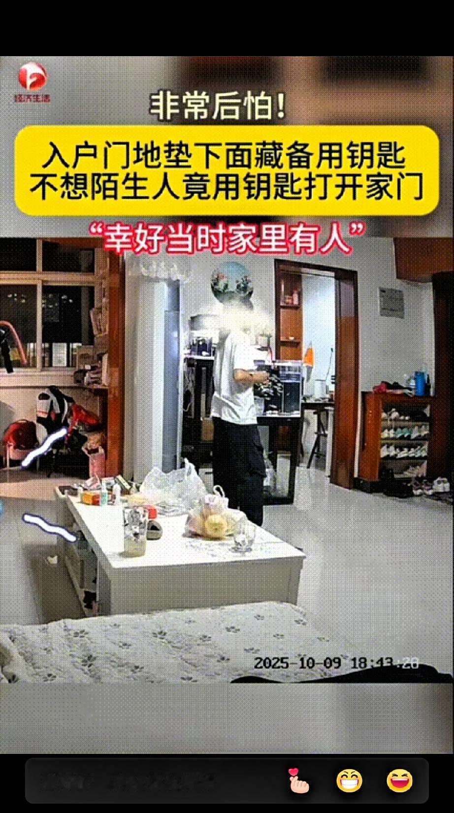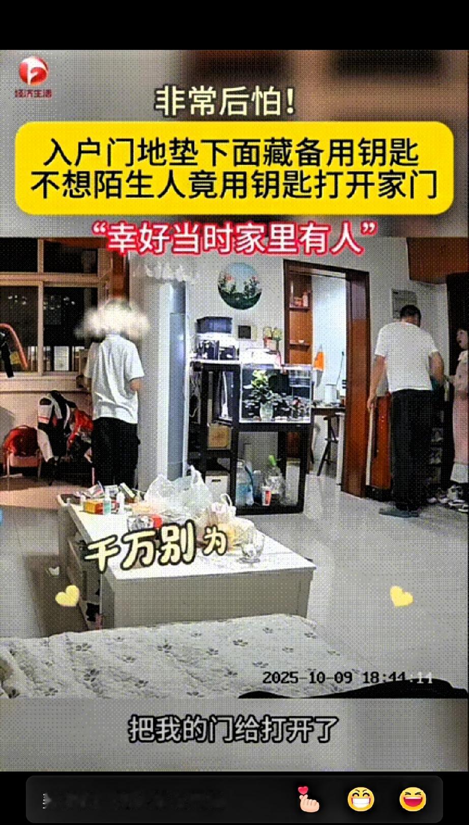 这也太吓人了!北京夫妻俩带着孩子待在家里,媳妇正窝在沙发上歇着,突然听见门外传来钥匙拧锁的动静——一开始以为是邻居走错门,没太在意,可下一秒“咔嗒”一声,自家大门居然真的被推开了! 进门的是个陌生老头,手里还攥着钥匙,看见屋里有人,反倒先开口问:“你们家是不是在卖房?我跟孙子来看看房。” 媳妇当场懵了,追问才知道,老头的钥匙是从门口脚垫底下摸来的,还觉得“门口藏钥匙挺常见”。直到男主人出来,老头才反应过来自己闯了祸,慌忙道歉溜走,留下一家人后怕到不行:要是当时家里没人,谁知道会不会有人顺着这办法进门,家里的东西可就没保障了! 其实很多人都有过这种“图省事”的习惯:把钥匙藏在脚垫下、门框缝隙里,或是花盆底下,总觉得“别人找不到”。可这些所谓的“隐蔽点”,早成了大家默认的“藏钥匙区”,不管是像老头这样的误闯者,还是别有用心的人,稍微留意就能找到,简直是给家门安全留了个大漏洞。 家门安全从来不是小事,别为了省点麻烦赌“运气”。花几百块换个密码锁,出门不用揣钥匙,也不用怕钥匙被人拿走,晚上睡觉都能更安心。毕竟安全这事儿,多一份防备,就少一份风险。