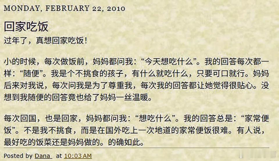 报道中提到其中一篇博文,文重流露出对家人和家乡的思念,怀念母亲做的家常便饭。