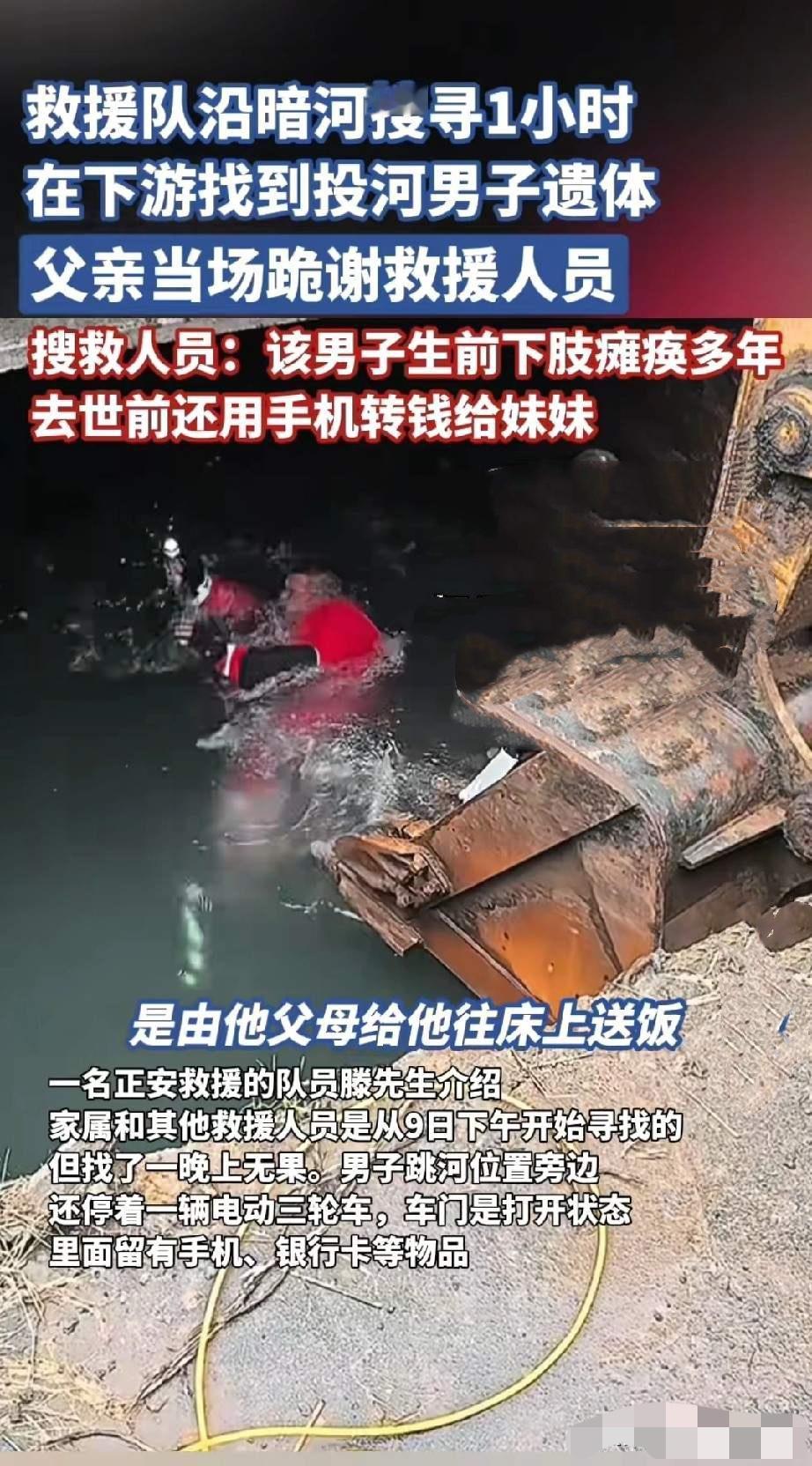 近日, 济南一名下肢瘫痪、生活不能自理的男子选择投河自尽,临终前他将手机里的钱转给妹妹,把银行卡和手机整齐放在河边,用最后的体面,向这个世界告别。 据邻居透露,男子瘫痪多年,如今已严重到吃饭需父母喂到床边。他的离去,被许多人解读为“不想再拖累父母”的无奈选择——在他眼中,自己的存在或许成了年迈父母无法承受的重担。 可当救援人员找到他时,父亲瞬间跪下的身影,却道尽了为人父母的痛彻心扉:对父母而言,孩子从不是负担,而是无论多难都想拼尽全力守护的牵挂。 这场悲剧,是个人尊严与现实困境碰撞下的极端结果。它让我们看到,长期瘫痪不仅摧毁了一个人的身体,更可能消磨掉他对生活的希望。 而在这份绝望背后,是否也隐藏着对“拖累家人”的深深愧疚?当一个人连基本生活都无法自理,他的“自我价值”该如何安放?