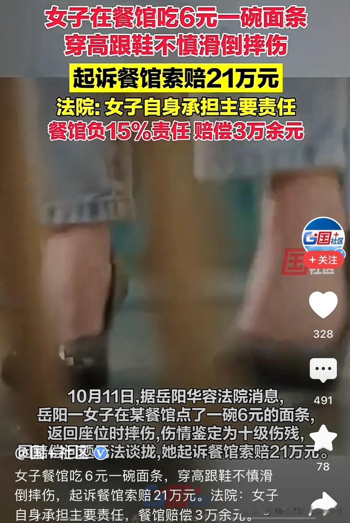 湖南岳阳,女子点了一份6块钱的面条,却在返回座位时摔倒了,结果造成左髌骨骨折,不仅动了手术,还要在家休养180天。面馆老板认为,那么多人都没有摔倒,女子摔倒是因为穿了高跟鞋,遂拒绝赔偿。女子一气之下将面馆老板告上法庭,索赔各项损失共计21万元,法院这样判!(来源:湖南岳阳华容法院) 据悉,女子刘某下班后不想做饭,于是便来到一家面馆,花了6块钱点了一份面条。 等面条做好之后,面馆的老板招呼刘某可以去前台取餐了。 结果没想到,刘某端着面条回到座位的时候,在经过推拉门时,脚底一滑竟然摔倒了。 刘某疼得直不起身来,面馆老板见状,连忙拨打了120急救电话。 经医院的检查,刘某左髌骨骨折,需要进行手术治疗。 出院之后,刘某自行做了伤情鉴定,鉴定为十级伤残,建议伤后伤休180天,护理90天,营养60天。 这也就意味着在以后的180天的时间内,刘某无法进行工作,也就失去了生活来源。 自己是在面馆里摔伤,面馆自然要改个说法。于是刘某便来到面馆,要求老板对自己进行赔偿。 可面馆的老板却表示,刘某之所以摔倒,是因为穿着高跟鞋,跟面馆并没有什么关系。 双方因为赔偿的事宜始终无法达成一致,无奈的刘某一纸诉状将面馆老板告上了法庭。 那么从法律的角度,该如何看待这件事呢? 首先来说刘某在面馆里吃饭,在聚餐过程中摔倒,餐馆是否有一定的责任呢? 《民法典》第一千一百九十八条规定,宾馆、商场、银行、车站、机场、体育场馆、娱乐场所等经营场所、公共场所的经营者、管理者或者群众性活动的组织者,未尽到安全保障义务,造成他人损害的,应当承担侵权责任。 虽然上述法律规定了,面馆作为经营者应该尽到安全保障义务。不过至于面馆是否要承担赔偿责任,还需要根据具体情况而定。 法院为了查明真相,专门到面馆进行实地调查,发现刘某摔倒的地方铺有专门的防滑垫,这也证明面馆尽到了一定的安全保障义务。 另查明,刘某经常到这家面馆吃饭,属于常客,对于面馆的布局是比较了解的。 《民法典》第十八条规定,成年人为完全民事行为能力人,可以独立实施民事法律行为。十六周岁以上的未成年人,以自己的劳动收入为主要生活来源的,视为完全民事行为能力人。 刘某作为一名完全民事行为能力人,在明知穿高跟鞋可能会进一步加大摔倒风险的前提下,并没有提高对自己的安全保护意识,应该为自己的行为负主要责任。 法院这样判。 法院认为餐馆作为经营性场所,理应承担对顾客的安全保障义务,刘某所摔倒的地点为门口的台阶处,存在一定的坡度,具有一定的安全隐患,餐馆应该承担部分赔偿责任。 而刘某作为一名成年人,因为疏于对自己的安全提醒,是导致自己摔倒的主要原因,应该承担主要责任。 综上法院判决,由面馆赔偿刘某3万余元。 对此你怎么认为呢?关注@胡究法的如法炮制 多学法律少吃亏。