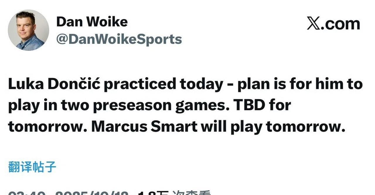 斯玛特明天将迎来湖人生涯首秀! 据NBA记者Dan Woike报道:东契奇今天参加了全队合练,球队计划是让他参加两场季前赛,但是明天的比赛还是待定,不确定是否会上场,而斯玛特将会在明天的比赛中迎来首秀! 斯玛特此前因为跟腱炎缺席了前两场比赛,但是最近训练都有参加,明天主场迎战勇士的比赛,将会迎来斯玛特湖人生涯的首秀。 而东契奇因为夏天消耗过大,球队计划在未来几场比赛中让他出战两场比赛,其余比赛好好休息。#nba# #湖人# #东契奇# #洛杉矶湖人# #NBA热点#
