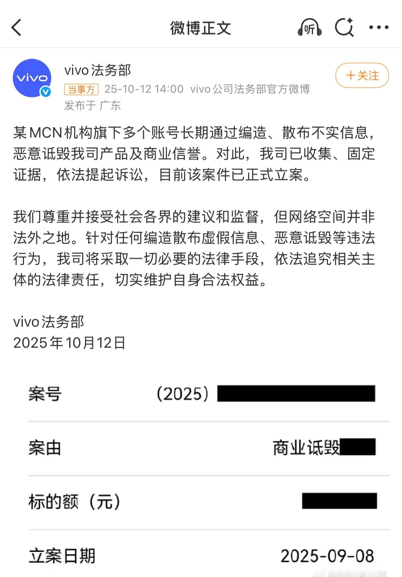 vivo起诉某MCN诋毁索赔近千万[努力]连这么佛系的蓝厂法务都忍不住重拳出击了