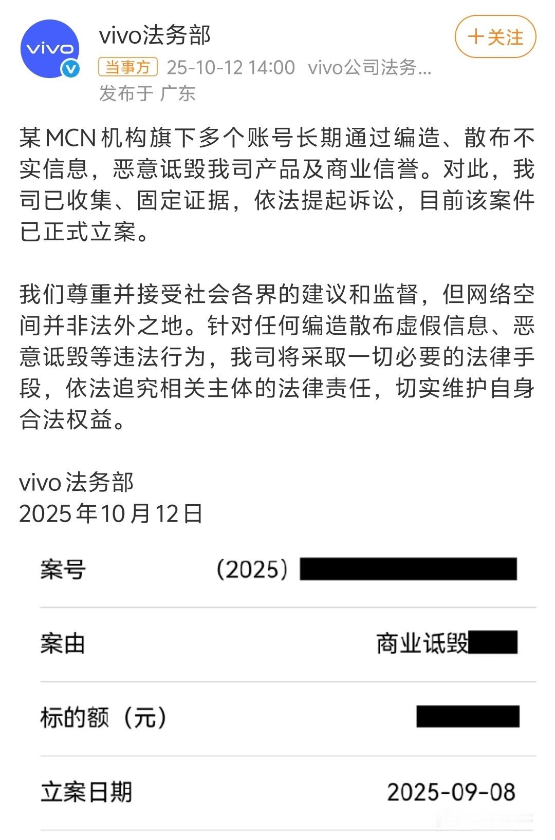 支持采取法律手段,维护合法权益!一切黑公关行为,都不可为!vivo起诉某MCN诋