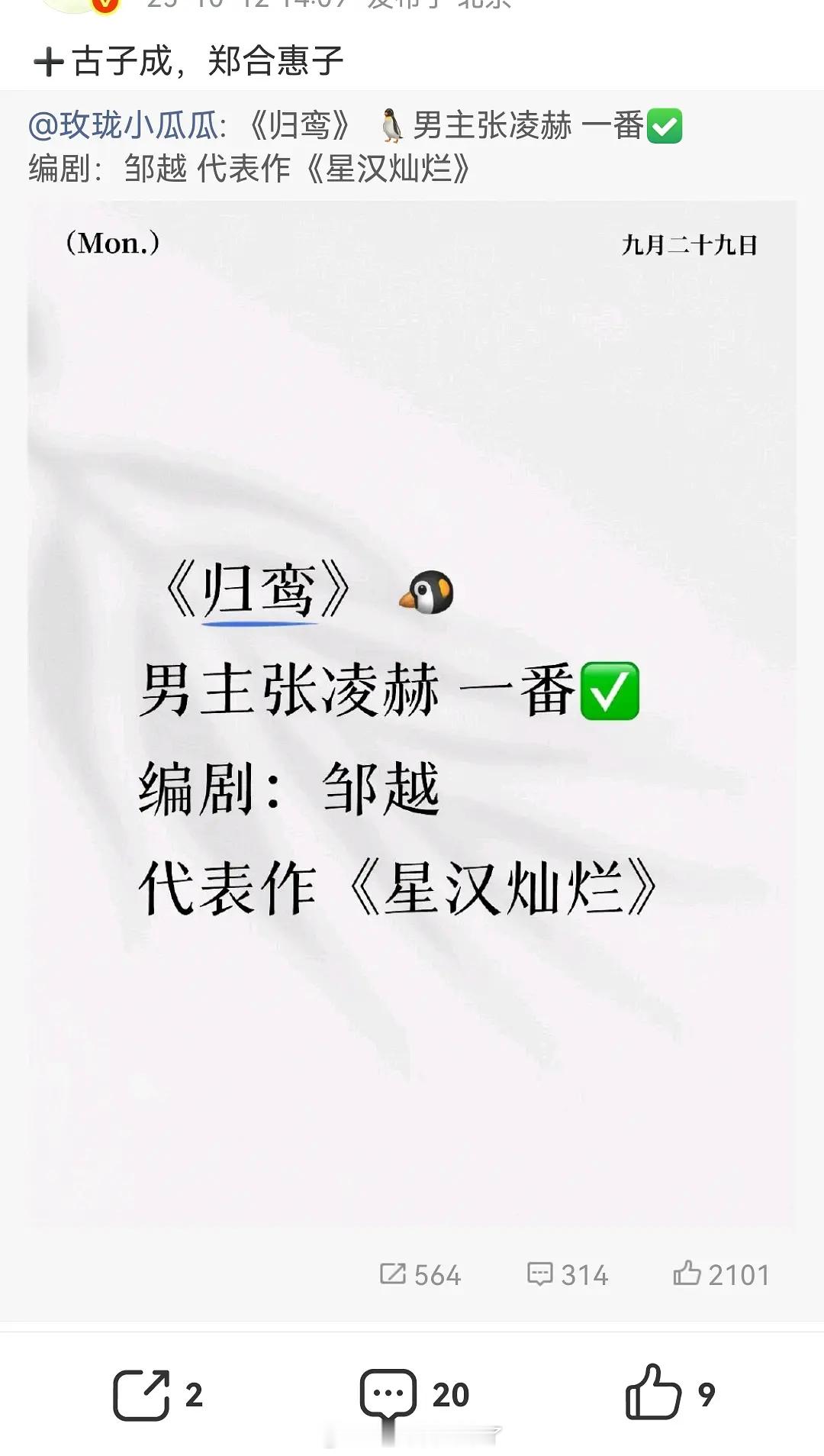🍉《归鸾》阵容是:张凌赫、林允、古子成、郑合惠子,导演是曾庆杰,编剧是邹越。