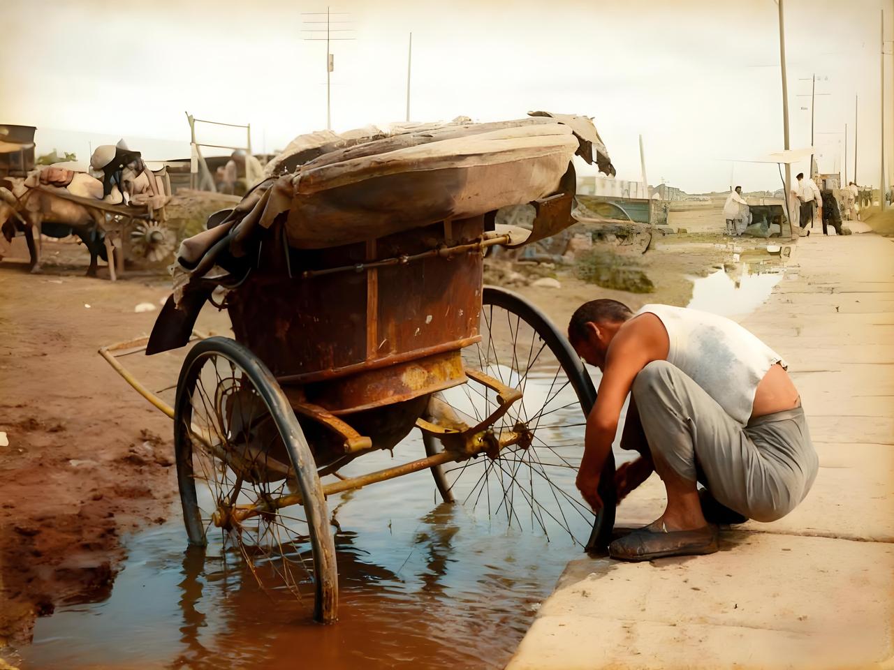 上世纪二三十年代的街头,一处水溝旁,黄包车夫正蹲在地上,专注地查看积水中的车轮。他身形微弓,双手似乎在触碰或检查着什么,黄包车的车轮部分浸在水里。 周围的街道,能看到一些模糊的旧时建筑与设施轮廓,整体氛围带着那个年代特有的市井气息。至于他是特地把车拉到这里洗轮胎,还是检查车轮状况,从画面中暂难完全确定,但那专注于车轮与积水的姿态,透出他对赖以营生的黄包车的在意,仿佛在认真对待这与生计紧密相关的“伙伴”。