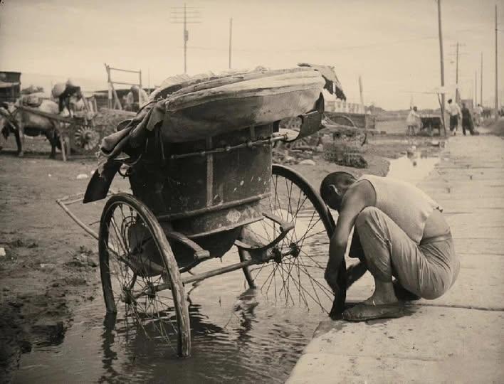 上世纪二三十年代的街头,一处水溝旁,黄包车夫正蹲在地上,专注地查看积水中的车轮。