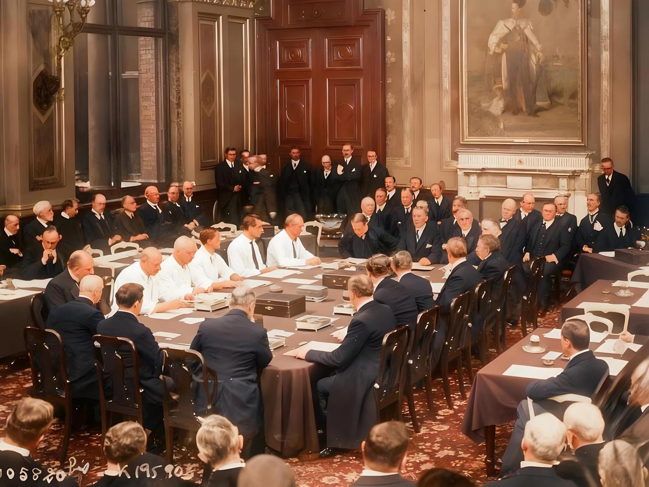 这张照片展现的是洛迦诺会议(1925年10月召开)的场景。装饰华丽的会议室内,各国代表围坐于长桌旁。他们身着正式的西装或礼服,神情或专注研讨,或略带思索。 会议旨在通过协商解决欧洲安全问题,与会国(英、法、德、意、比、捷、波等)签订了一系列条约,总称《洛迦诺公约》。其中,公约虽有“欧洲各国普遍裁减军备”的相关意向性表述,但核心是确认德国与法、比的边界现状,承诺通过和平方式解决争端,同时德国被允许加入国际联盟(1926年德国如愿入盟)。 不过,公约实际对德国的约束有限,反而让德国获得了政治平等地位,为其日后突破凡尔赛体系限制、重新武装埋下隐患,所谓“防止再次爆发世界大战”的目标并未真正实现,二战的爆发也证明了这一点。