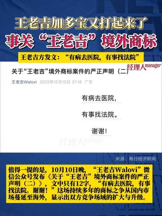 王老吉与加多宝这对老对手再度“开战”!9月30日,王老吉指责加多宝恶意抢注海外商标,妨碍其海外市场的拓展。而加多宝则表示,早在2000年代初就已合法取得海外王老吉商标的所有权,还称这是“前瞻性战略”。 10月10日上午,加多宝再次发表声明强调商标归属问题,当晚王老吉便霸气回应:“有病去医院,有事找法院。谢谢!”这简短有力的回应,直接将这场“口水战”推向了高潮。看来王老吉已不愿再与加多宝多作纠缠,打算让法律来评判是非,且看后续法院如何判决吧。 王老吉 王老吉碳酸饮料 王老吉罐茶 广药王老吉 王老吉价格