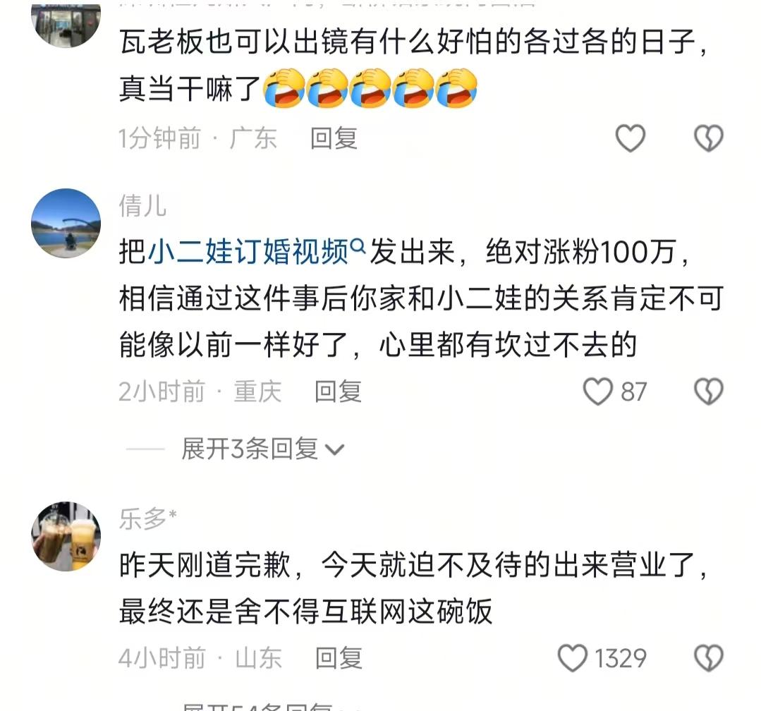 我预料到了超娃会出道歉视频 也预料到了他可能会停更半个月到一个月 万万没想到结果没过两天就刷到他的新视频,这真的没想到 前几天刷到超娃道歉视频,还心想“这次总算要反思几天了吧”,结果没过两天就刷到他的新视频,跟超妈在地里拔辣椒、摘辣椒,还说“今年能收上百斤,算丰收”。我晕,之前看别的网红因为争议道歉,至少停更半个月,有的还捐钱做公益,超娃这“道歉刚过就营业”的速度,真的让我郁闷——这道歉到底是真心的,还是走个过场啊? 说实话,我刚点进超娃视频的时候,还挺期待看真实的农村生活,结果越看越不对劲——超娃拔辣椒树,手上连点泥都没有,超妈摘辣椒,指甲缝里干干净净,哪像真干过农活的?之前我朋友给我看一个假农村网红的视频,也是拍拔萝卜,结果镜头一转,萝卜是提前埋进去的,超娃这视频,咋跟那个有点像呢? 本来想安慰自己“可能人家干活利索,没沾泥”,但看到超娃说“上百斤算丰收”,我和小伙伴都惊呆了——视频里那筐辣椒,看着也就十几斤,上百斤得装多少筐啊?再说辣椒季尾声,正常农户收辣椒都得分批摘,哪有“拔两棵树就满筐”的?我外婆之前总说“那些讲因果的人常说,踏实做事瞒不了人”,超娃这视频,咋越看越像“演出来的踏实”呢? 视频下面的评论更让我绷不住了——有网友说“发小二娃订婚视频绝对涨粉100万”,我的天,这是把人家的私人关系当流量密码了?之前 就有消息说超娃家跟小二娃“心里有坎”,现在倒好,直接建议人家用订婚涨粉,这不就是逼着他们消费私人情感吗? 我之前关注过一对农村情侣博主,就是因为老被网友催着发订婚视频,最后两人闹别扭,账号都停更了。网友总说“没人跟钱过不去”,可钱再多,也不能把“信任”当儿戏吧?我妈之前跟我说“别人讲的‘种善因得善果’,其实就是攒信任,你把信任败光了,再多粉也没用”。超娃要是真听了这建议,就算涨了100万粉,把跟小二娃的关系搞僵了,值得吗? 总之,我也懂网红要吃饭,没人跟钱过不去,但“吃饭”和“吃相”得分清吧?要是道歉只是为了堵住网友的嘴,转头就忙着拍视频赚流量,那这道歉还有啥意义?就像小时候犯错,刚说完“我错了”就接着调皮,谁还信你啊?你说是吧!