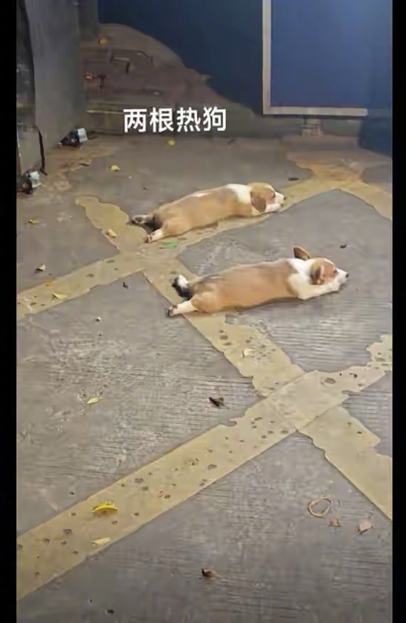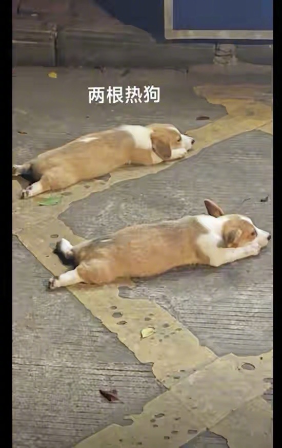 两只小狗板鸭趴在地上降温,秒变成两根“热狗”!还挺聪明的呀!
