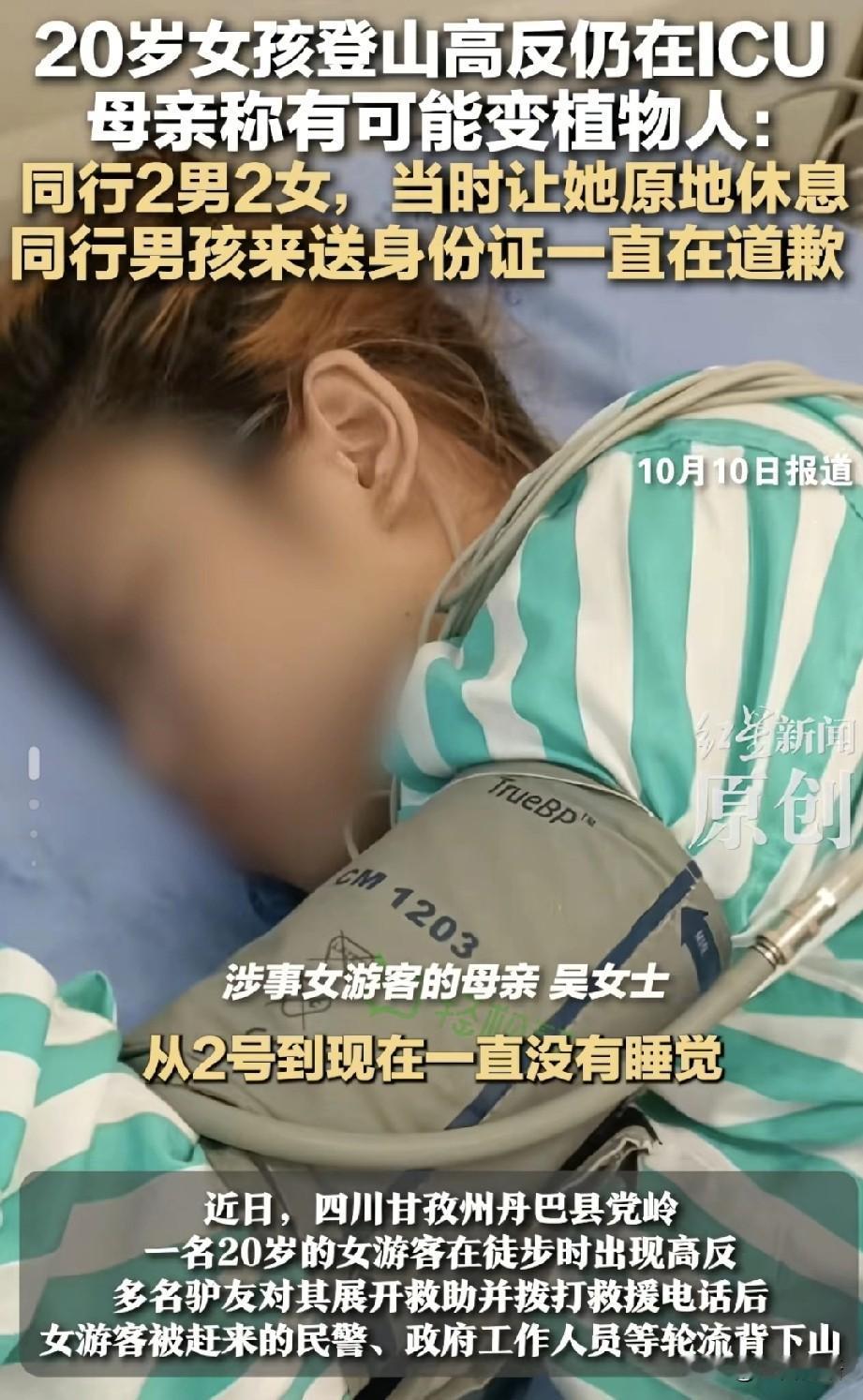 还记得之前提到的那个遭遇失温的女孩吗?谁也没想到,事情的发展竟会如此沉重。 最新消息传来,由于严重的高原反应加上失温,她被确诊为高原性脑水肿,并因缺氧缺血引发了脑病,还伴随脑疝形成。10月8日,医生紧急为她做了开颅手术,可术后至今,她仍然没有醒来,只能依靠呼吸机维持生命体征。医生表示,如果脑水肿持续压迫脑干,颅内压力降不下来,可能还需要进行第二次手术。至于她何时能苏醒,完全取决于脑损伤的恢复程度,情况很不乐观,极有可能成为植物人。 她才刚从卫校毕业,人生画卷本应徐徐展开,却在一夕之间坠入这样的绝境。更令人心酸的是,她来自一个普通的农村家庭,如今每天数千元的治疗费用,早已将这个家所有的积蓄耗尽。原本平静安稳的生活,因为一次旅行,被彻底拖入了深渊,只留下一声无力的叹息。 这几年,去新疆、西藏、川西等高海拔地区旅行的人越来越多,社交平台上处处可见雪山草原的壮美风光。然而很少有人意识到,高原反应和失温竟可能带来如此严重的后果。不少人误以为高反只和身体素质有关,甚至觉得平时爱运动、体能好就没事。但实际上,高反与体质并没有必然联系,有时反而身体好、代谢快的人反应更明显——因为这类人对氧气需求更高,一旦缺氧,适应过程反而更困难。 我曾因工作去过新疆,目的地海拔四千多米。刚在酒店放下行李,后脑勺就像被重锤敲击一样剧烈疼痛,还伴随着强烈的恶心。当时我没敢耽搁,立刻赶往医院,果然是高原反应。医生说如果不及时处理,很可能发展成肺水肿或脑水肿,后果不堪设想。在医院吸氧大半天后,头痛才逐渐缓解。但直到离开高原地区,我心里仍存着后怕。 要知道,高原脑水肿的进展非常迅速。从最初的头痛、头晕,到恶心呕吐、意识模糊,再到彻底昏迷,整个过程可能不超过六个小时。一旦延误治疗,就可能造成不可逆的脑损伤。回想那个二十岁的姑娘,也许一开始她只是轻微头疼,以为忍一忍就能过去。可恰恰是这一念之间的侥幸与拖延,让病情从可控走向了不可挽回。 所以今天特别想提醒大家:去高海拔地区,真的不能拿身体去赌。出发前务必做足准备,最好提前半个月服用红景天,备好抗高反药物;到达之后不要急着洗头洗澡或剧烈运动,先留出一到两天让身体适应环境;一旦出现头痛、心慌、恶心甚至意识模糊等症状,千万不要硬撑,立即暂停行程、尽快就医。 再美的风景,都不及生命的珍贵。别让一次旅行,成为一生的遗憾。