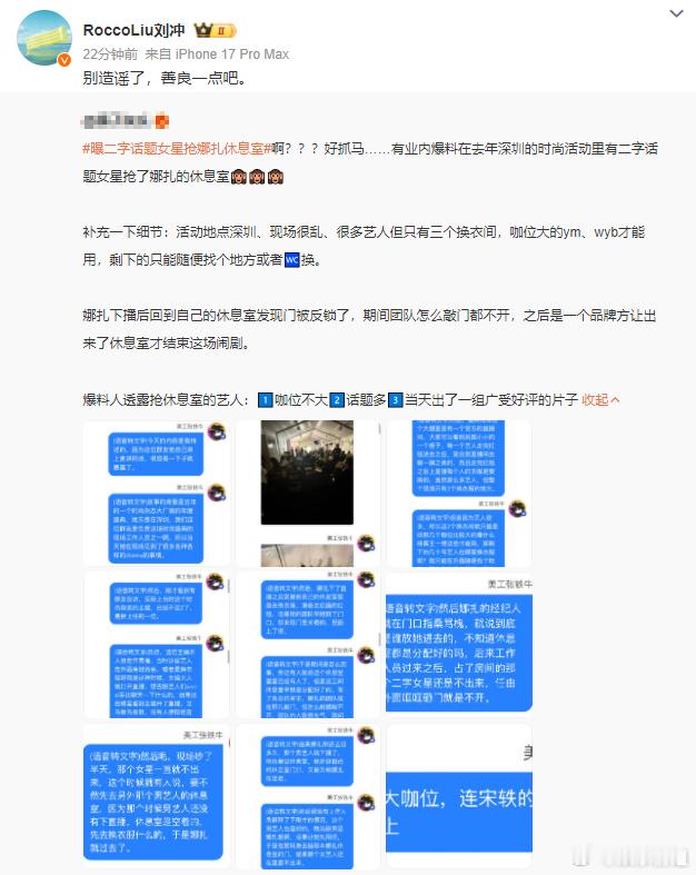 刘冲别造谣了善良一点吧关于有网友“曝二字话题女星抢娜扎休息室”这个争议,刘冲发