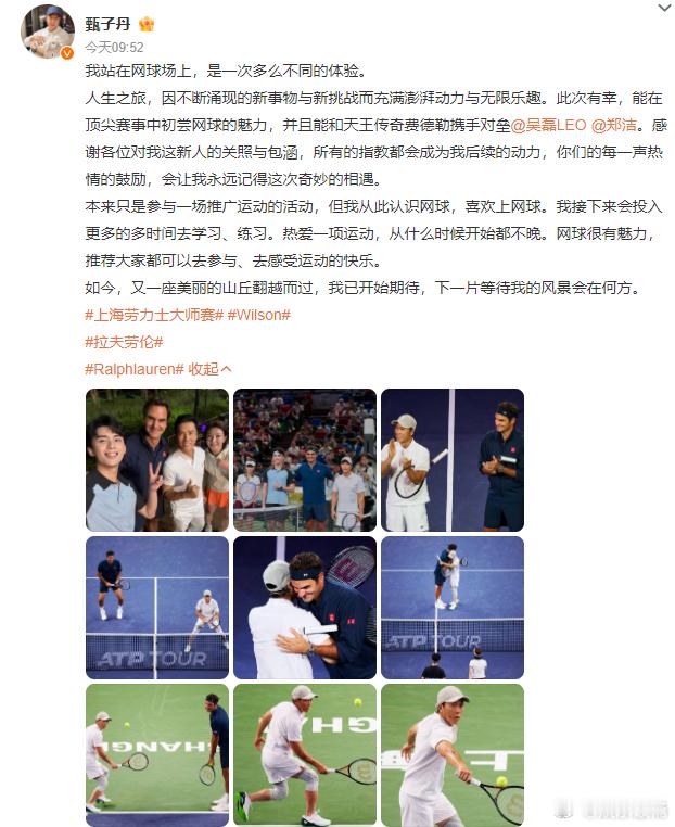 甄子丹回应和郑洁吴磊网球对打 甄子丹:“此次有幸,能在顶尖赛事中初尝网球的魅力,并且能和天王传奇费德勒携手对垒