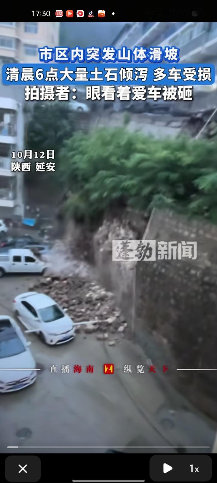 10月12日,延安市宝塔区丰泽园小区一处半体路基突发塌陷滑坡,有车辆被埋受损。有目击者称,山体滑坡发生时间时早上六点,停在山脚下的车辆被掩埋,自己的爱车叶受损了。事发后,公安、消防、120均赶到现场