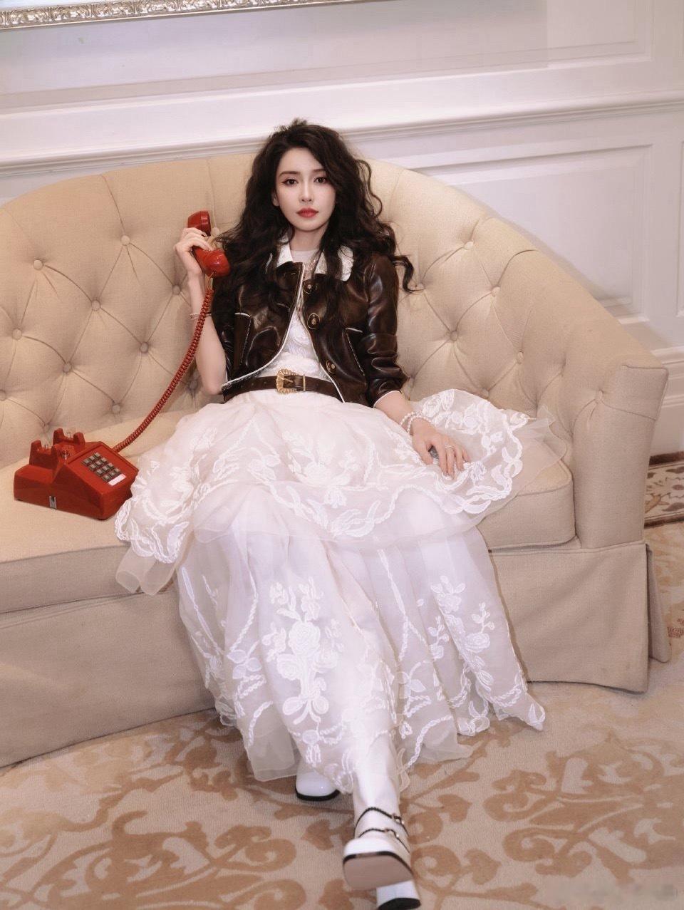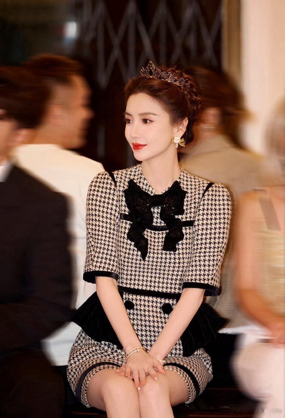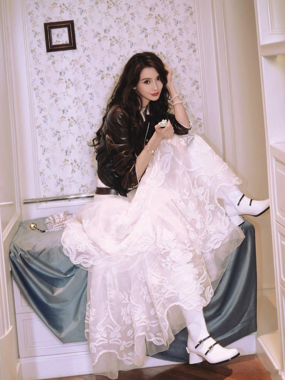 ·Angelababy身着一袭Alexis Mabille 2023秋冬高级定制系列的裸色斜肩蕾丝花边短裙亮相, 裸色系衬托肌肤质感,生图状态获赞"糊图也挡不住美貌"。