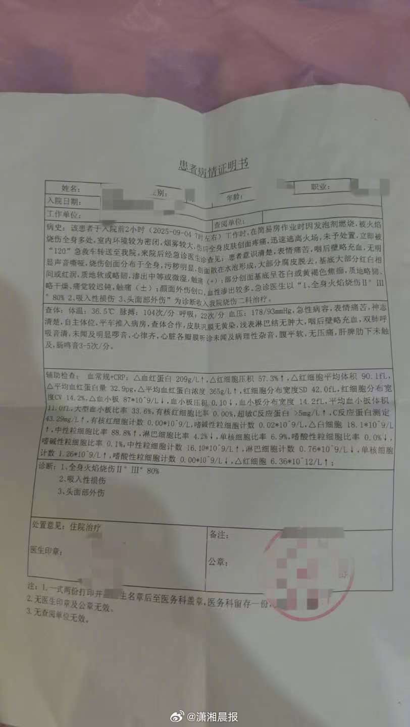 稍后该手机号短信回复,伤者及其家属在网络上的说法不属实,其丈夫、公公被烧伤,是其中一位伤者在喷聚氨酯发泡保温的过程中违规吸烟明火导致,室内发现烟头、烟盒、火机等,该回复表示,应急局会出鉴定报告。