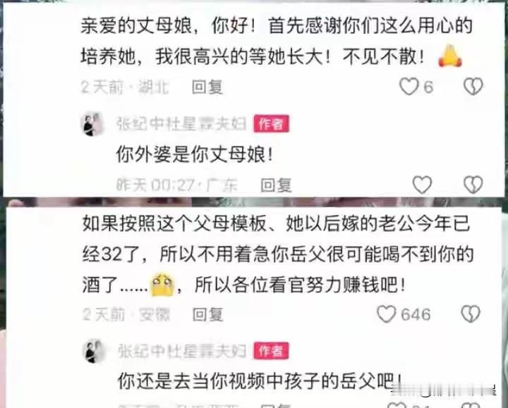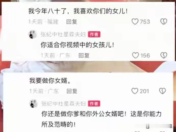 骂的好!兔子急了还咬人呢!(虽然这比喻有点不恰当) 近日,张纪中发视频为小女庆生,没想到有些黑粉竟在评论区表示要做张纪中女婿,喊杜星霖丈母娘。 为此,张纪中也好不客气回称,你还是做你爹和你外公女婿吧。同时,杜星霖也表示:“来一个,我骂一个。”她说,“之前我和张导的言论,再恶毒我都没有追究。我只是一个母亲,这是我作为一个母亲保护孩子的天然反应。” 不得不说,张纪中夫妇骂的好,法律规定婚姻自由,人家两口子相爱是个人权利,其他人无权说三道四,再说了,网络不是法外之地,触犯法律是要承担法律责任的。 对此,大家怎么看?