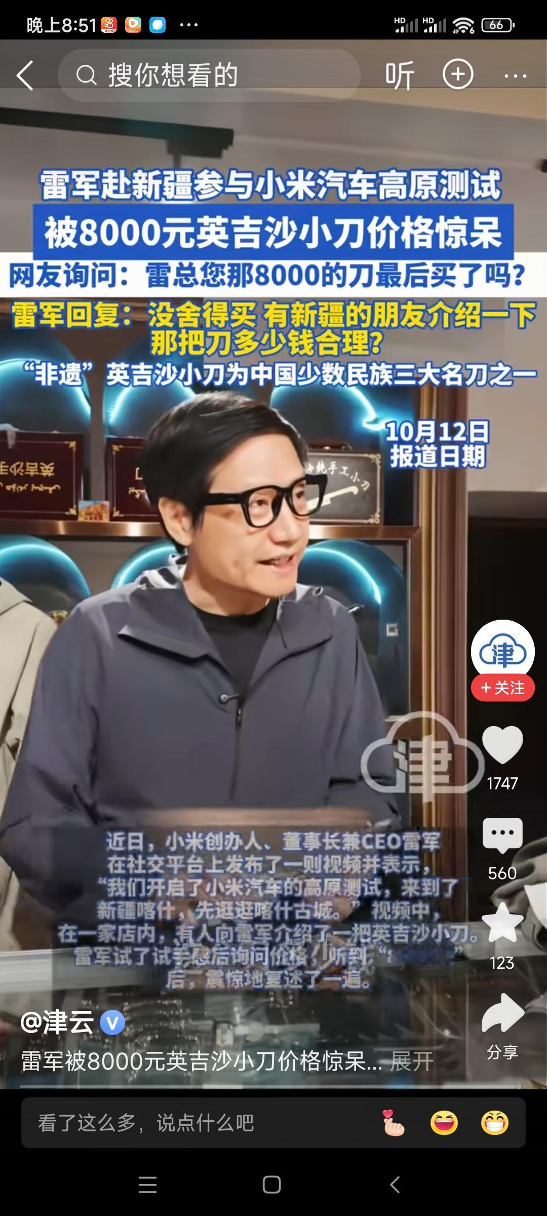 《观英吉沙刀有感》 雷军偶见刃光寒, 英吉沙刀标价繁。 八千币值惊双目, 疑是珍奇落世间。