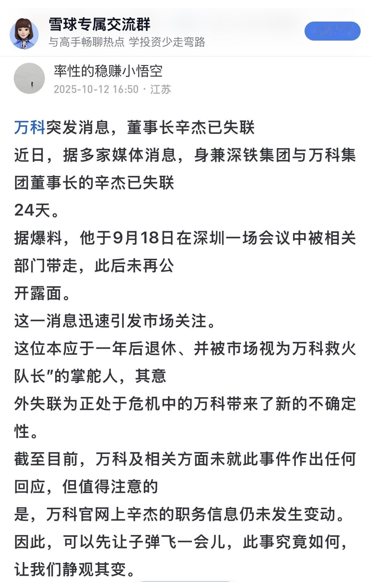 鉴于辛杰失联事件的严重性,万科与深铁的持续沉默,可能意味着问题正在发酵。当前急需官方发布消息以澄清真相。
