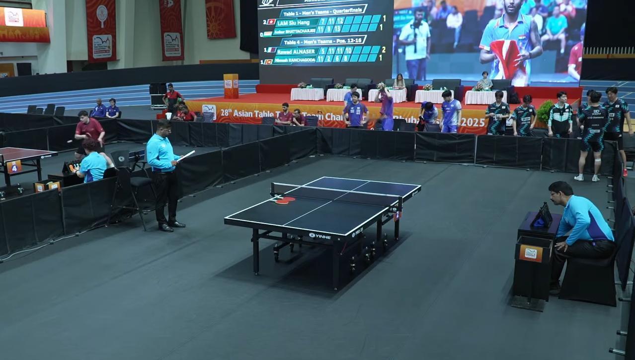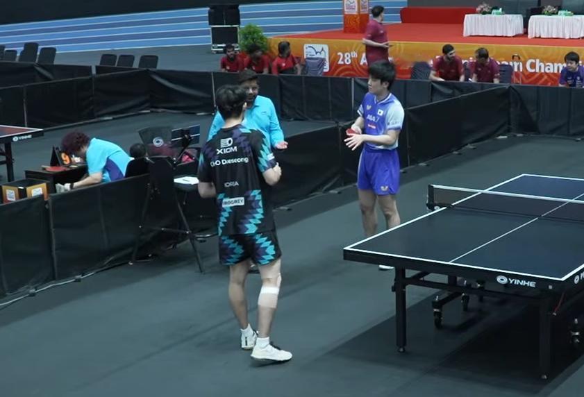 坏了,印度亚锦赛这环境,对国乒非常不利。 你看这环境, 别说鹰眼, 就连围挡都不正规。 也没有观众席, 咱们中国观众怎么去呐喊助威? 这不是咱们国乒习惯的环境。 而且你看这地胶, 怎么一条一条的? 这难道是一次性的? 我觉得印度办的亚锦赛彻底砸场子了, 连WTT的支赛都不如!