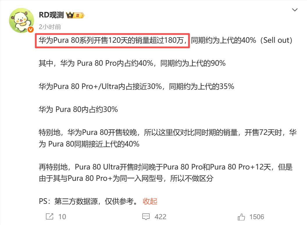 所以说华为Mate70系列、华为Pura80系列这几个销量数据都不一定准~ 感觉也确实,Pura80系列再怎么低迷,也不至于不到200万销量。