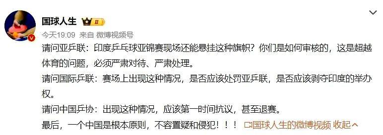 自从各个协会的球员来到印度的布巴内斯瓦尔后,一些奇葩的事情就相继出现。 然而,更奇葩、更令人费解、更令人糟心的事情出现了! 主办方竟然在场馆的上空悬挂了不该出现的旗帜。 在场的国内球迷、媒体人和国乒的相关人员迅速行动,进行了强烈的反馈。 后来,该旗帜被撤掉。 依旧有不少球迷还是建议国乒应该退赛,以表达自己的态度。 一个中国原则不容侵犯! 网友对此表达观点: 阿三阿四?不三不四,实属欠揍![呲牙][呲牙][呲牙][呲牙][呲牙][呲牙][呲牙] 中国乒协应正告亚乒联“一个中国原则不容置疑!必须在网站等媒体公开道歉!”[发怒][发怒][发怒][发怒][发怒][发怒] 下次印度来参赛,我们也挂一下克什米尔旗子,他们这样做就是有意为之。 这个国家咋没有个正形,国际组织的活动不应出現这样的事,无规则