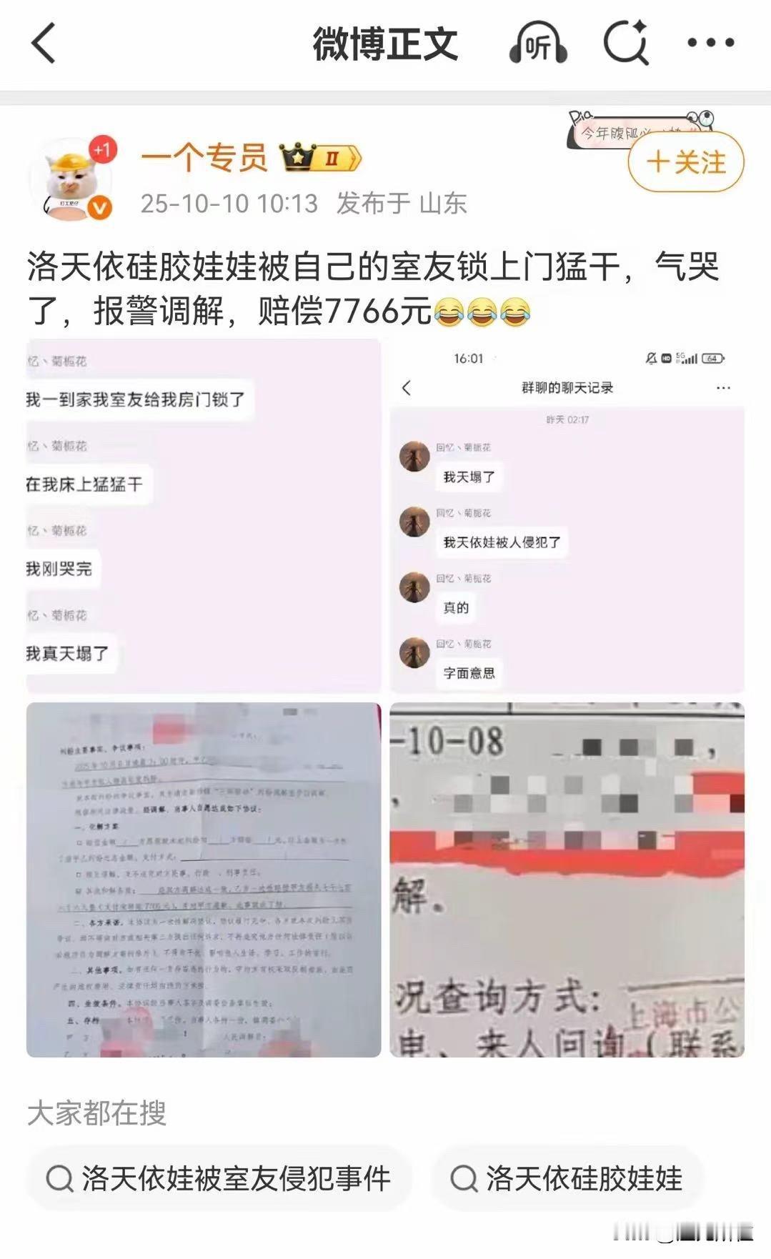 今天被这条微博破防了!简直了!太炸裂了!感觉眼泪都出来了!什么奇葩人奇葩事啊!这就天塌了! 洛天依就是虚拟人物,跟初音未来类似,但她是中国技术生成的动漫形象,很多二次元宅的玩偶女神。 结果这位兄弟是洛天依爱好者,重金打造了一个洛天依娃娃,结果不小心没收好,被同寝室的室友给强了!关键事发当时,这位兄弟就被关在门外!想想那个场面吧!你的女神被你的室友侮辱了,而你在门外哇哇大哭爱莫能助!除了气哭还能报警!好家伙,警察来了,最后室友赔偿了7766…… 这个是娃娃清理费、维修费? 包括精神损失吗?![笑哭][笑哭][笑哭][笑哭]