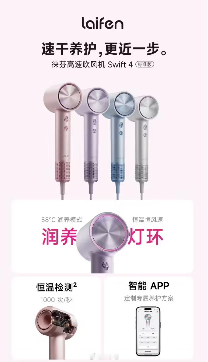 徕芬推出 Swift 4 标准版高速吹风,恒定温度 58°C,智能检测 1000 次 / 秒