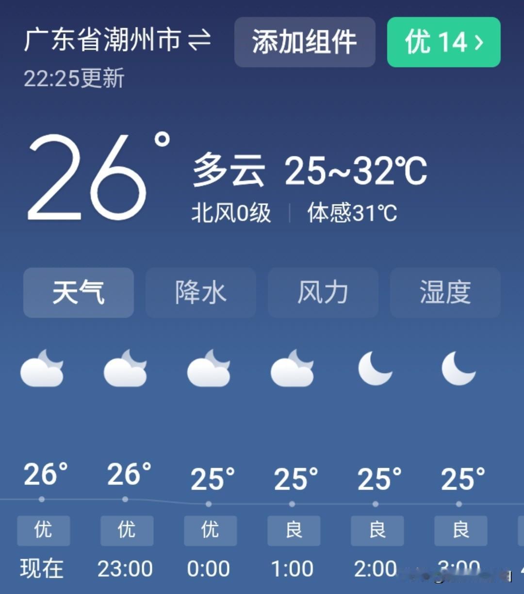 北方已经在过秋天了, 甚至初冬, 而南方还在高温超长待机, 广东也一直被高温硬控着…… 展望未来几天, 广东天气晴热为主雷雨冒泡! 今天(12日), 潮州喜提一个多云天气! 气温25~32℃, 此刻气温26℃。 可能大家都觉得26℃的气温应该挺舒适的, 但是, 请仔细看一下体感温度, 31℃呢! 夜里十点多的31℃也是很要命的, 异常闷热! 能不能把多余的热送点到北方去啊? 我们南方用不了那么多的! [捂脸][捂脸][捂脸][捂脸][捂脸][捂脸][捂脸][捂脸] 晒图笔记大赛
