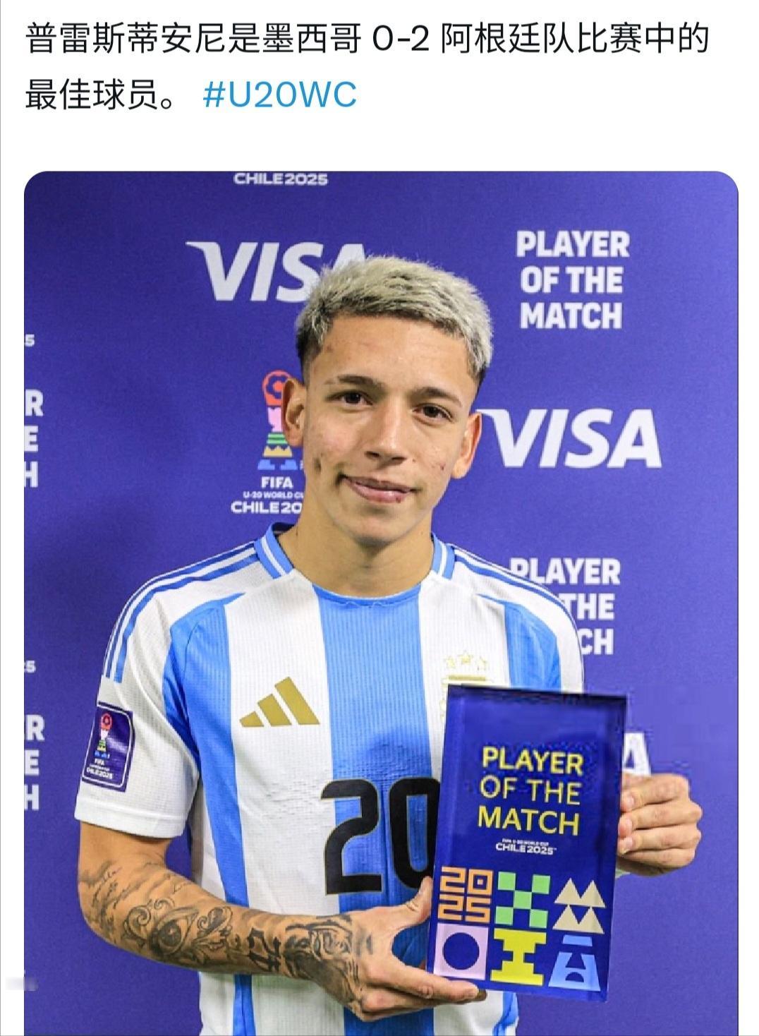在穆里尼奥的强烈要求下,本菲卡允许队内的19岁小孩詹卢卡·普雷斯蒂亚尼,代表阿根廷参加 U-20 世界杯,尽管这项比赛并非国际足联的规定义务型比赛,因此俱乐部没有义务释放球员,但在世界杯的前四场比赛中,这位“雄鹰”边锋始终是替补。但随着主力蒙托罗,在16强赛对阵尼日利亚比赛的第38分钟受伤——锁骨骨折,将不会再参加世界杯,普雷斯蒂亚尼才得以在昨晚对阵墨西哥的比赛中进入首发阵容。 然后表现堪称完美,身披20号球衣的普雷斯蒂安尼踢了80分钟,在为这场胜利起到决定性作用,他的中场突进过人,创造了将比分改写成1-0的进球。随后的茬架中,也是冲锋在前。 最终,他被评为国际足联当场最佳球员,但他对Man of the match奖项轻描淡写:“这应该是对整个球队的奖励,我们表现非常出色。我们在过去一周里努力训练,才取得了球场上的成就。”