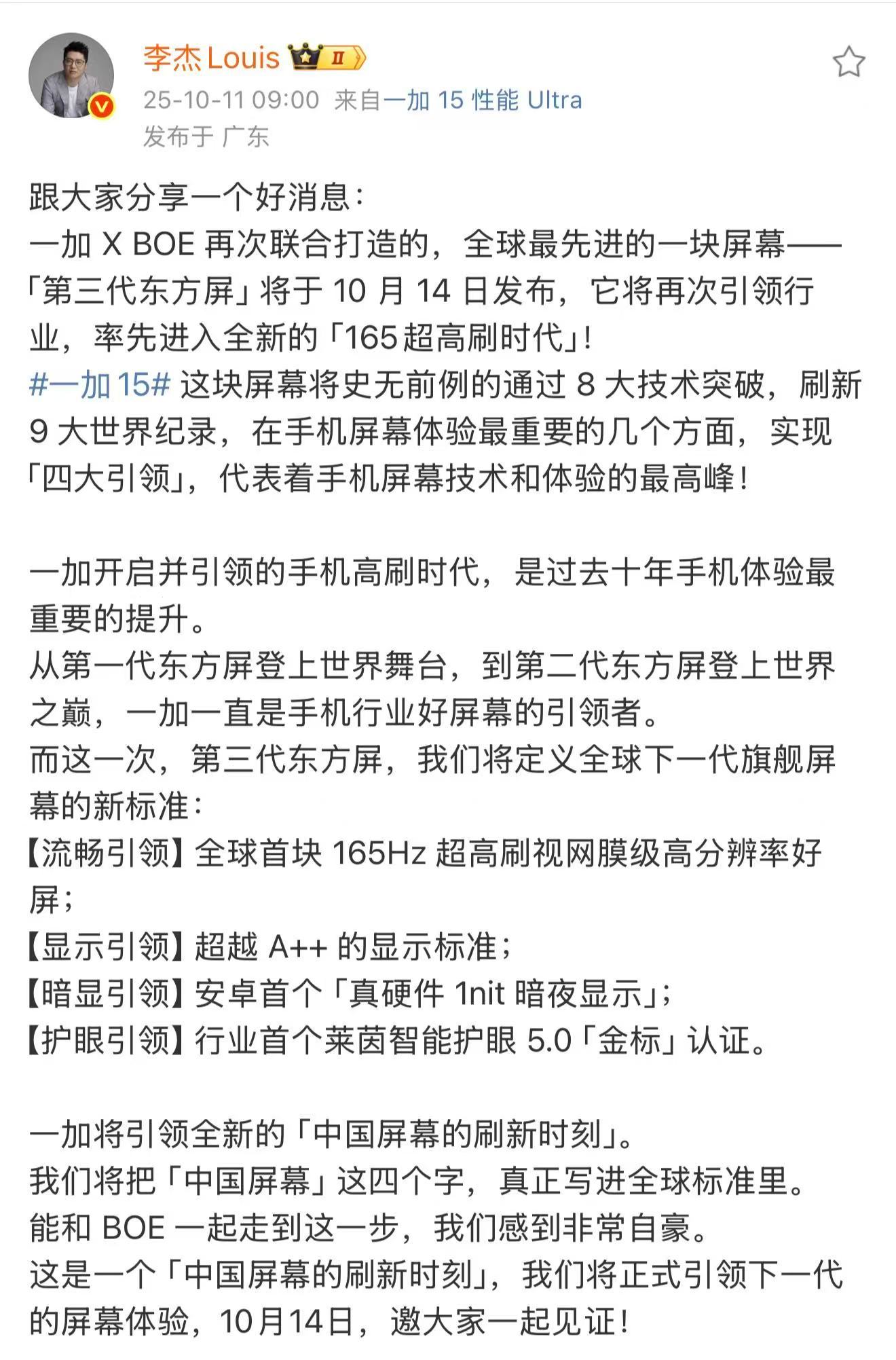 一加点亮了多块户外巨型LED屏,预热10月14日的屏幕沟通会,看来是非常重视啊,这也是对第三代东方屏胸有成竹的表现!我仍然记得当初从60Hz-90Hz那种旦用难回的体验,165Hz!太期待了[憧憬]