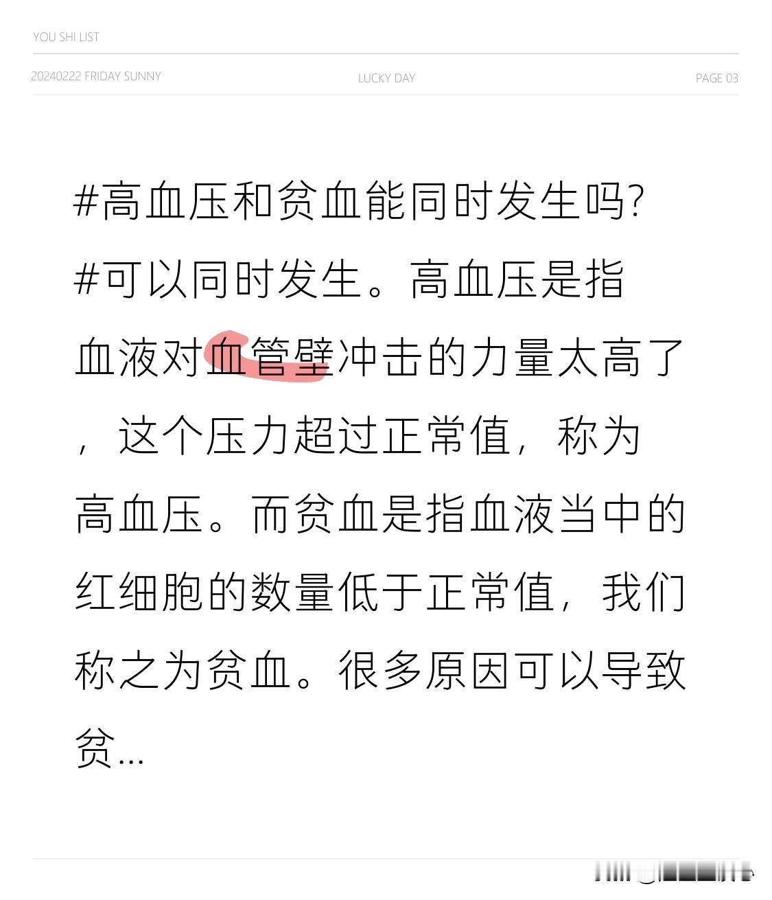 高血压和贫血能同时发生吗?可以同时发生。高血压是指血液对血管壁冲击的力量太高了,