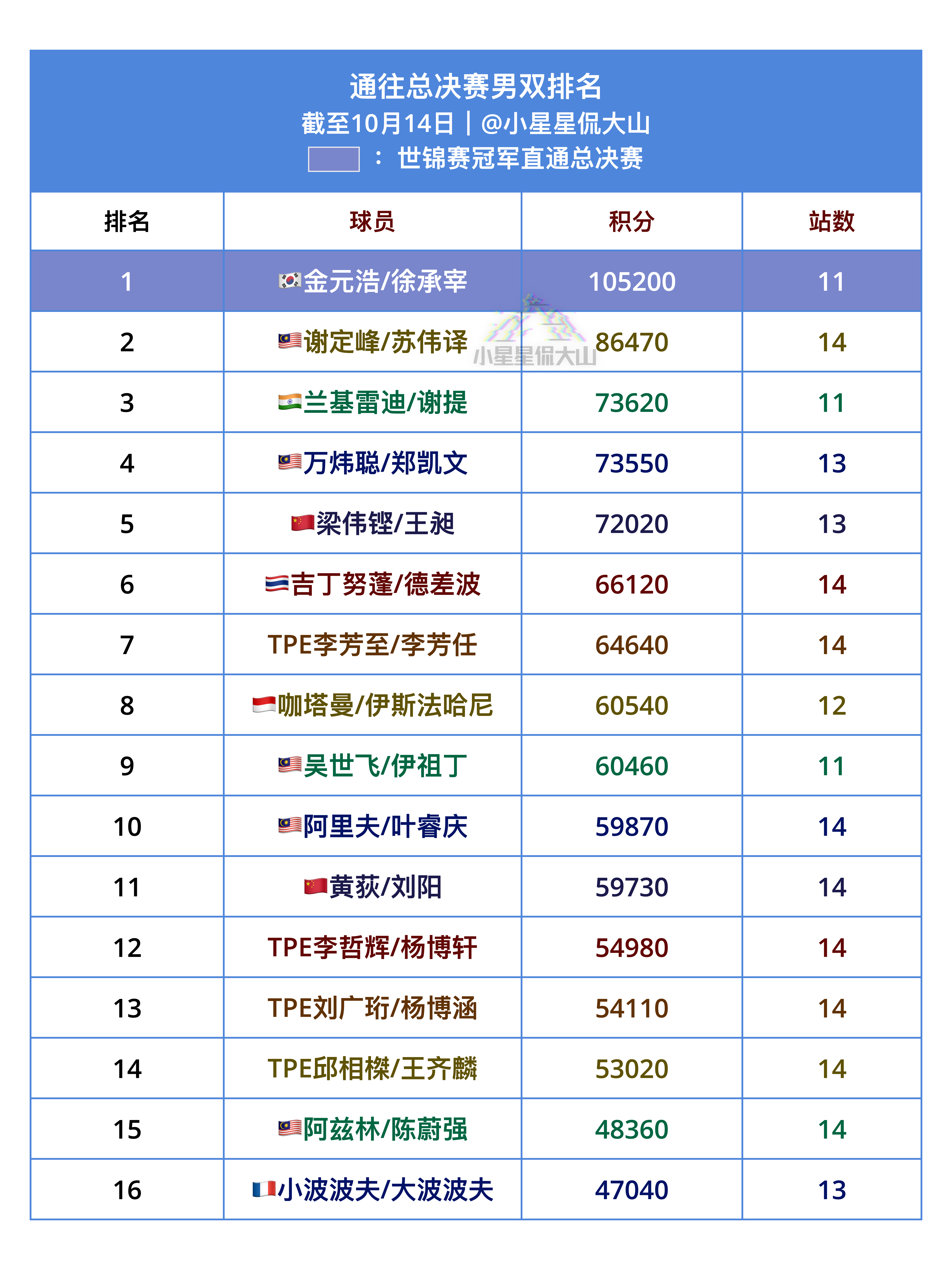 通往总决赛男双排名:世锦赛冠军直通总决赛